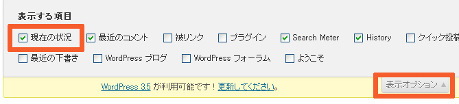 お使いのワードプレスに「現在の状況」のブロックがない場合は右上にある「表示オプション」をクリックして「現在の状況」にチェックを入れると表示されるようになります。