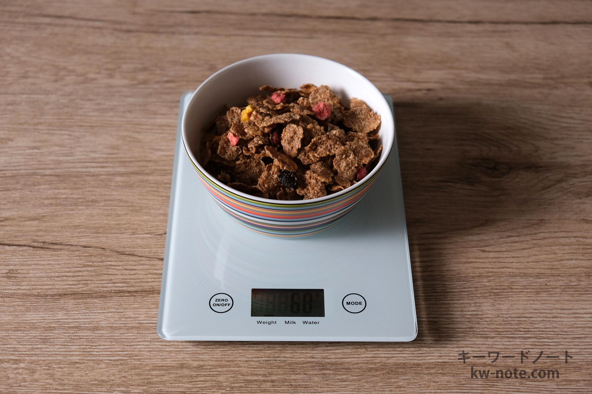 ケロッグから販売されているシリアル「オールブラン フルーツミックス」1食分の量はどれ位なのかと、各グラムごとの分量の目安、牛乳・ヨーグルト・豆乳をかけた時の栄養成分とともにまとめました。