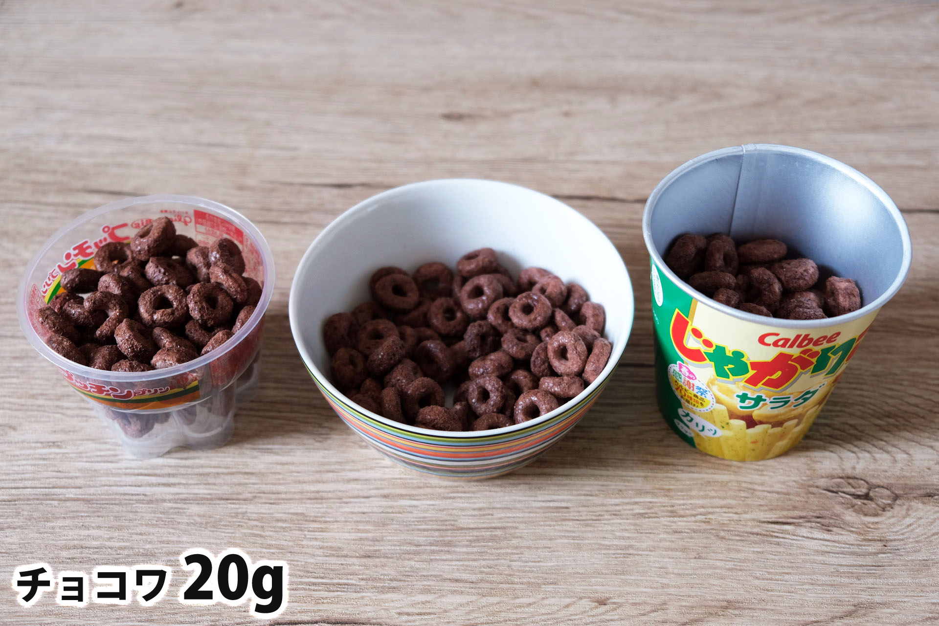 ケロッグから発売されている「チョコワ」(正式名:ココくんのチョコワ)の食べる量の目安をわかるようにグラム毎に色々な容器に入れ、その栄養成分も合わせて掲載しました。