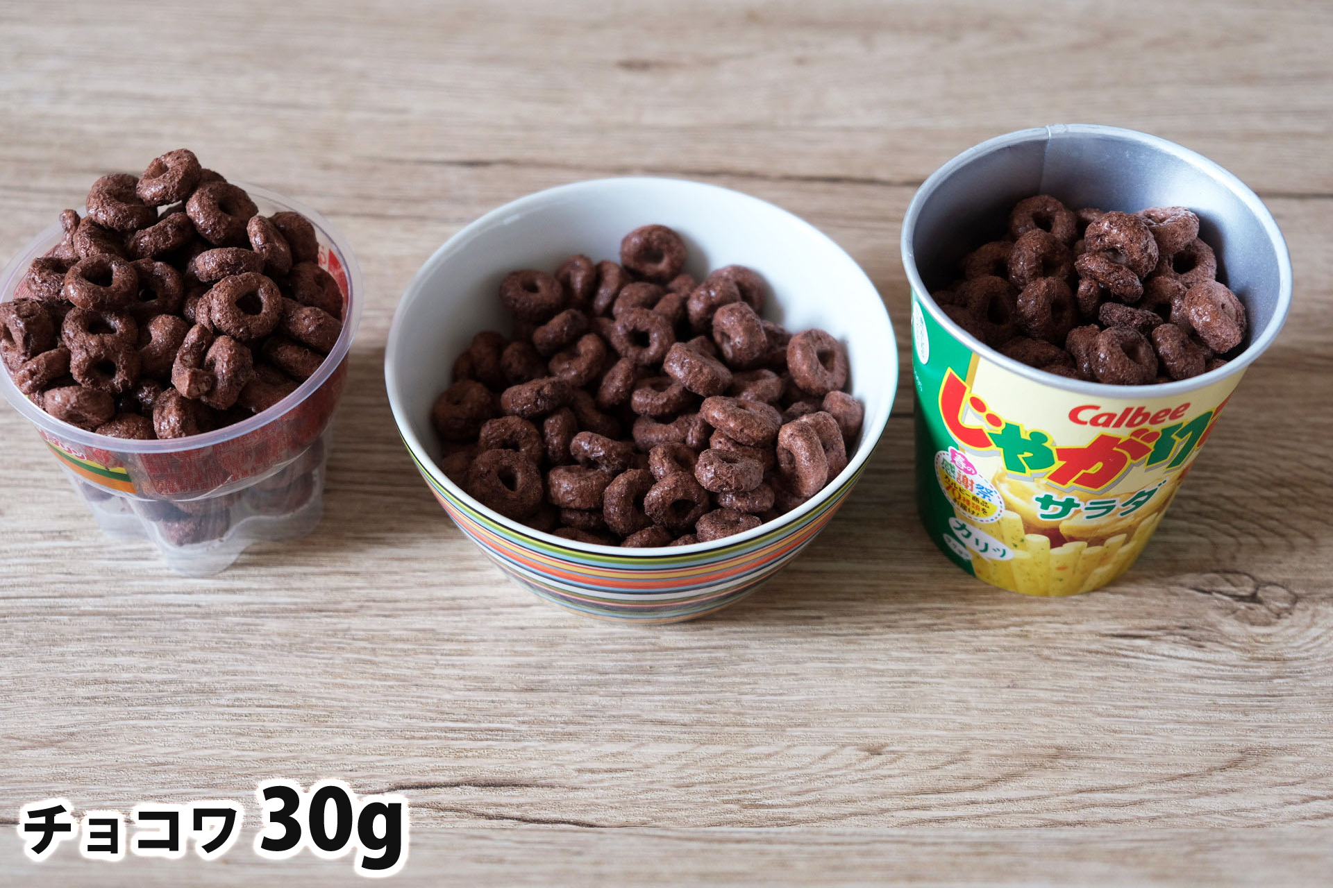 まずはメーカーから推奨されている1食分はどれ位なのかというと、チョコワのパッケージに掲載されている栄養成分表示に「1食分(30g)当たり」とありますので、チョコワ1食の標準的な量は30gといえます。