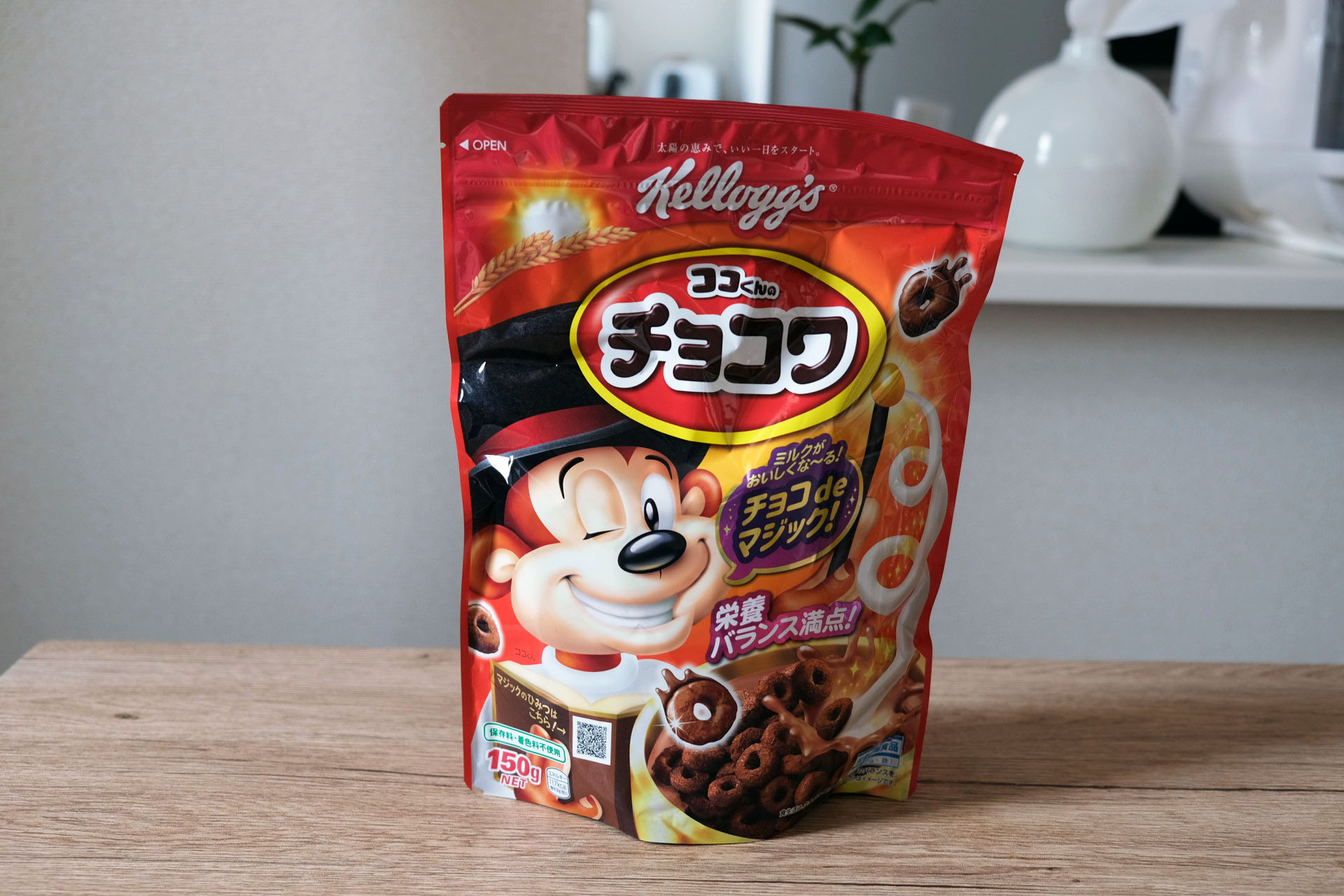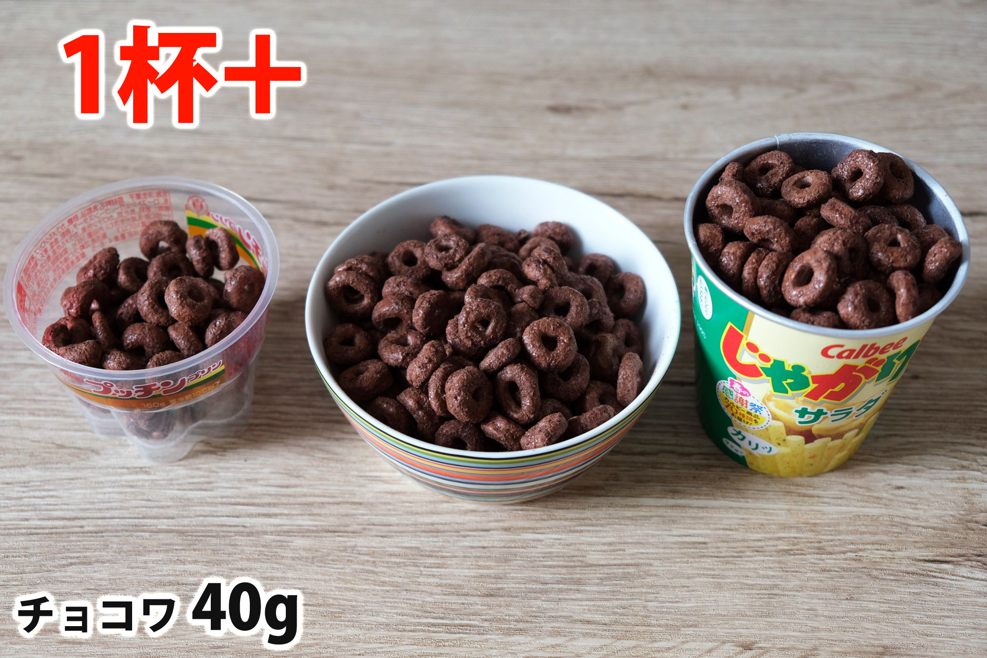 下の写真で使っているシリアルボウルはやや小さめの250mlですが、チョコワが軽いので30gでも結構なかさ(嵩)に。