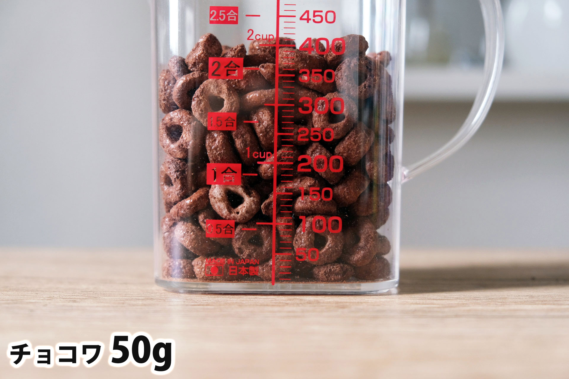 以下ではどれくらいの量なのかを視覚的にイメージしやすいよう、各グラムごとのチョコワをよく目にする容器に入れてみました。