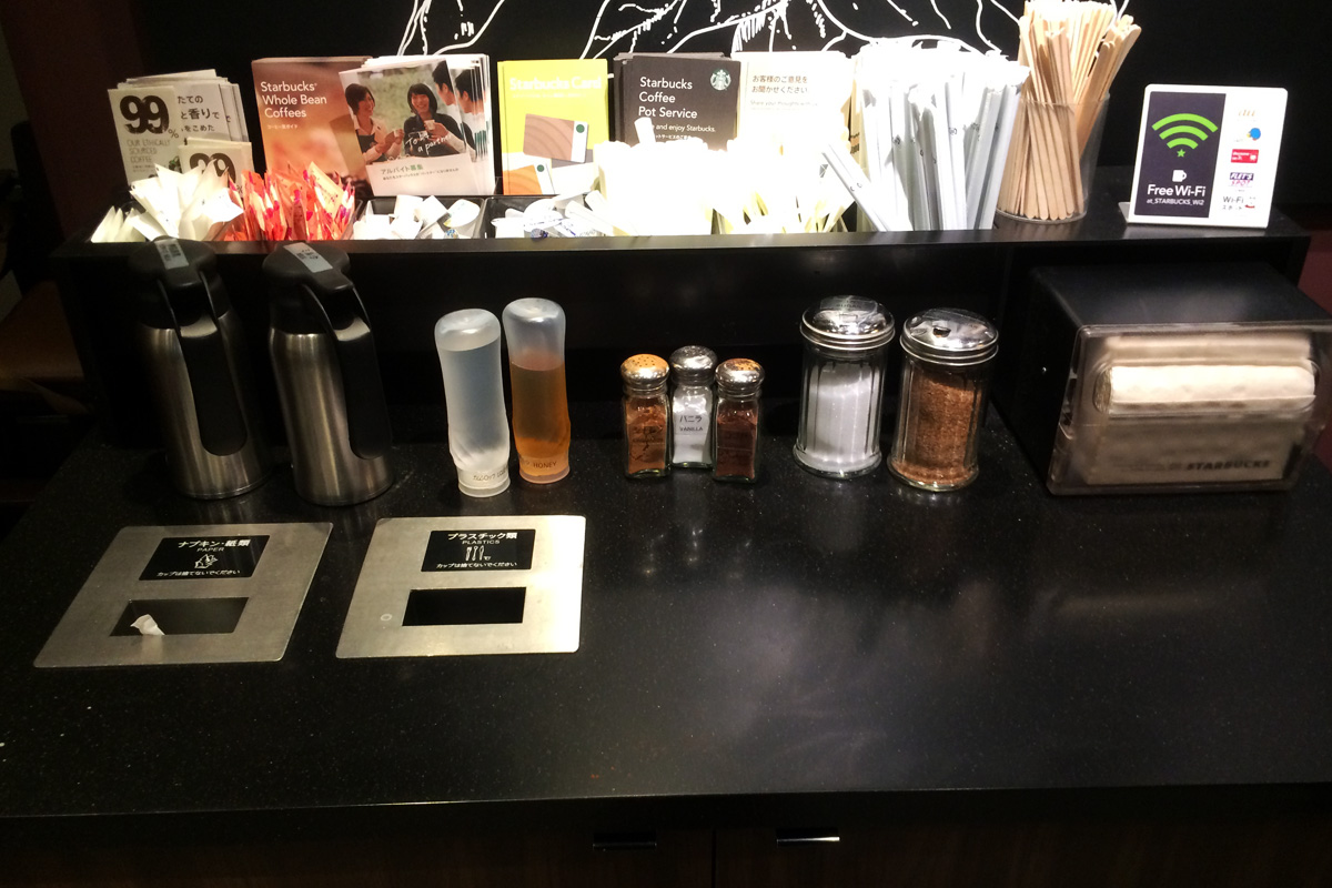 商品受け取りカウンターの近くには「コンディメントバー」というスペースがありますので、こちらに様々なトッピング素材が置かれているので、こちらで自由に行なえます。