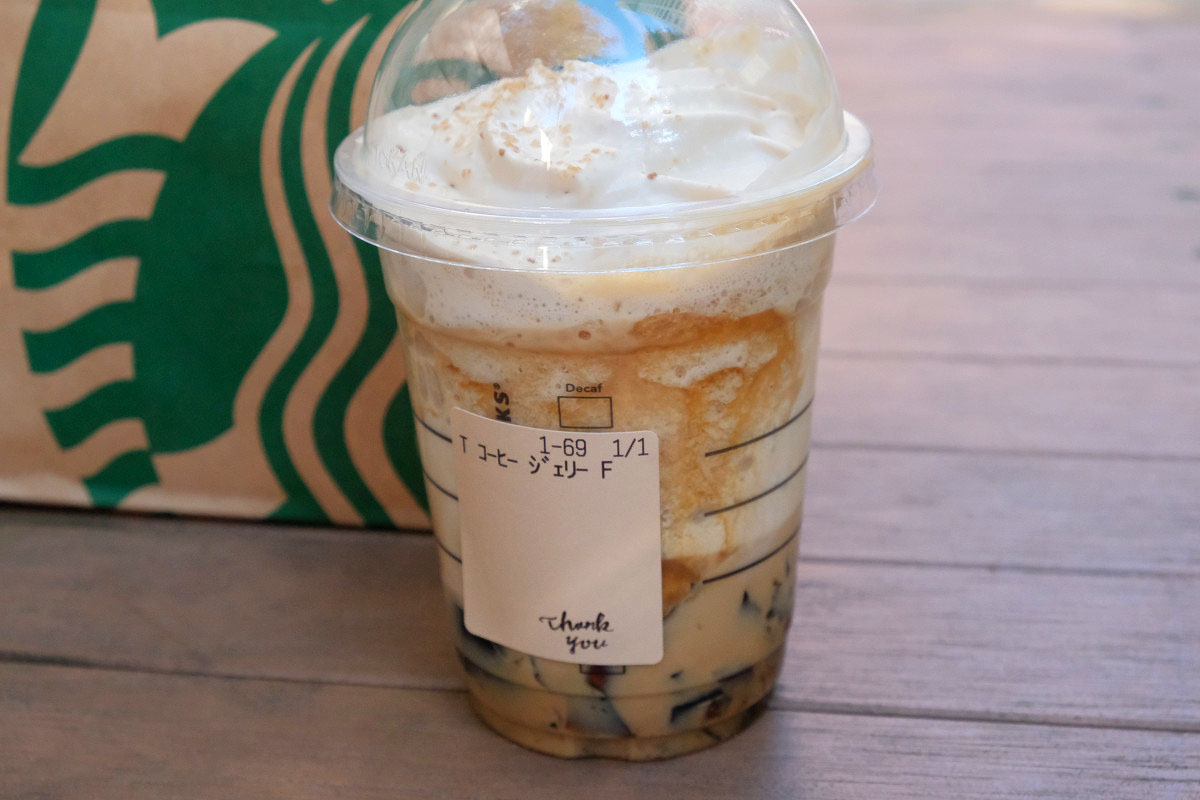 下の画像は2019年2月28日に期間限定販売された「クラフテッド コーヒー ジェリー フラペチーノ」ですが、こちらを例にフラペチーノの特徴を見てみましょう。