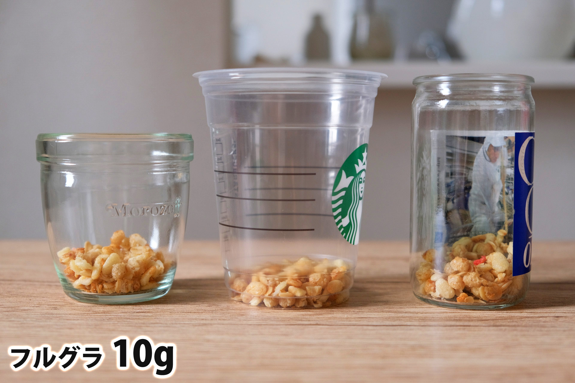 • フルグラ10gを「モロゾフ」「トールサイズのカップ」「ワンカップ大関」に入れた時の目安