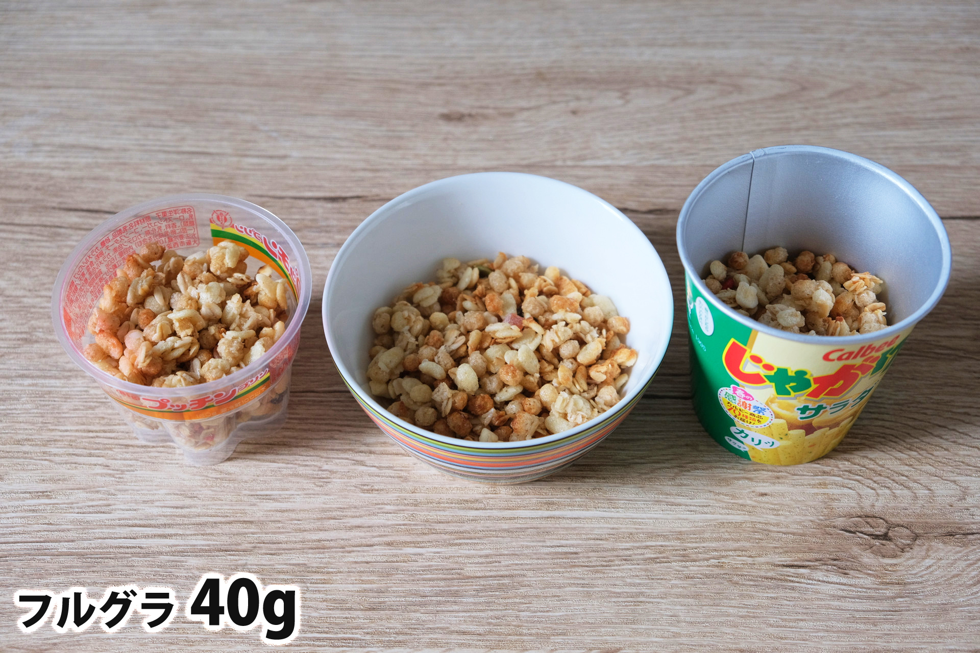 フルグラ40gを「Bigプッチンプリン」「250mlボウル」「じゃがりこカップ」に入れた時の目安