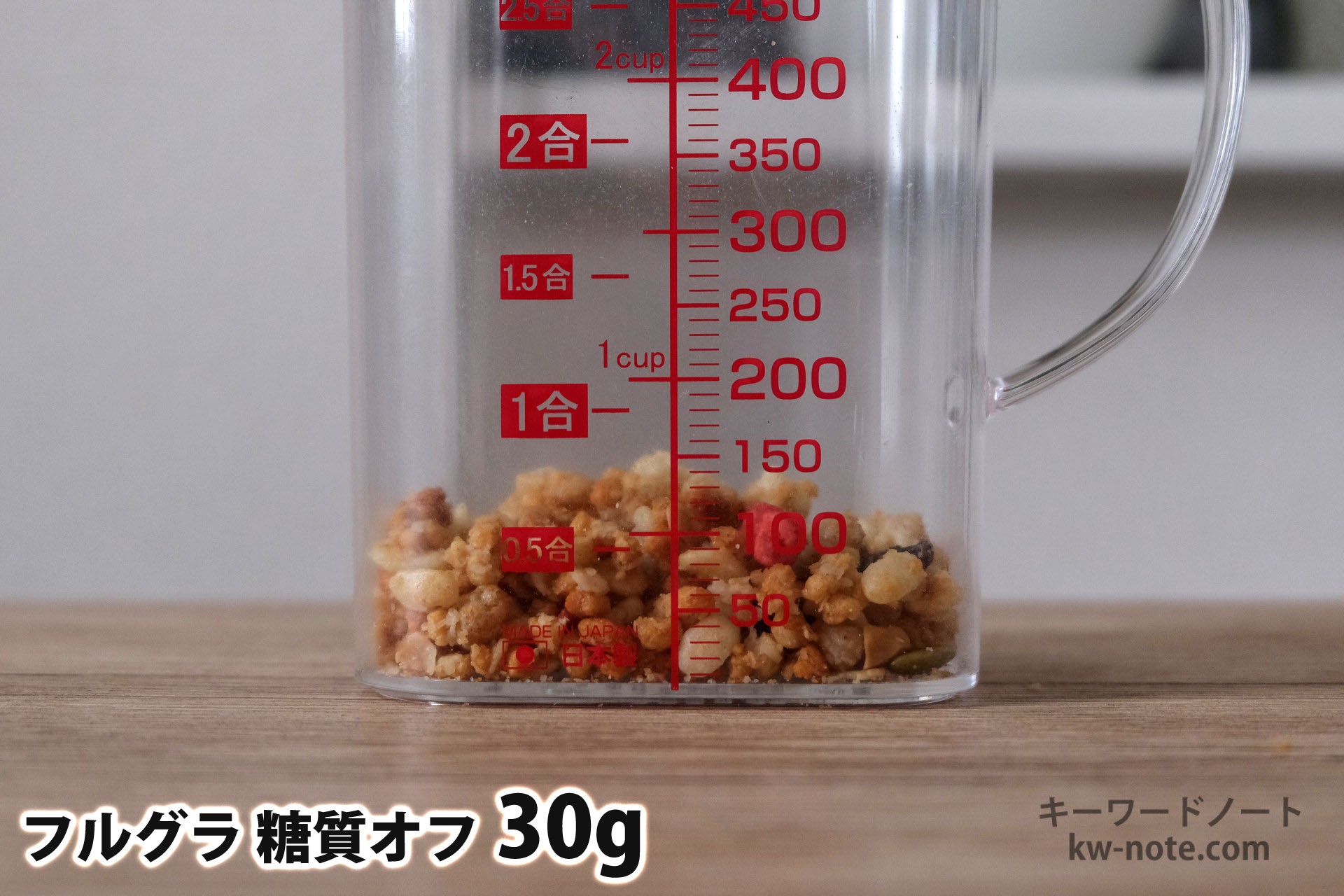 カルビーから販売されている、シリアルのグラノーラ「フルグラ 糖質オフ」1食分の量はどれ位なのかと、各グラムごとの分量の目安、牛乳・ヨーグルト・豆乳をかけた時の栄養成分とともにまとめました。