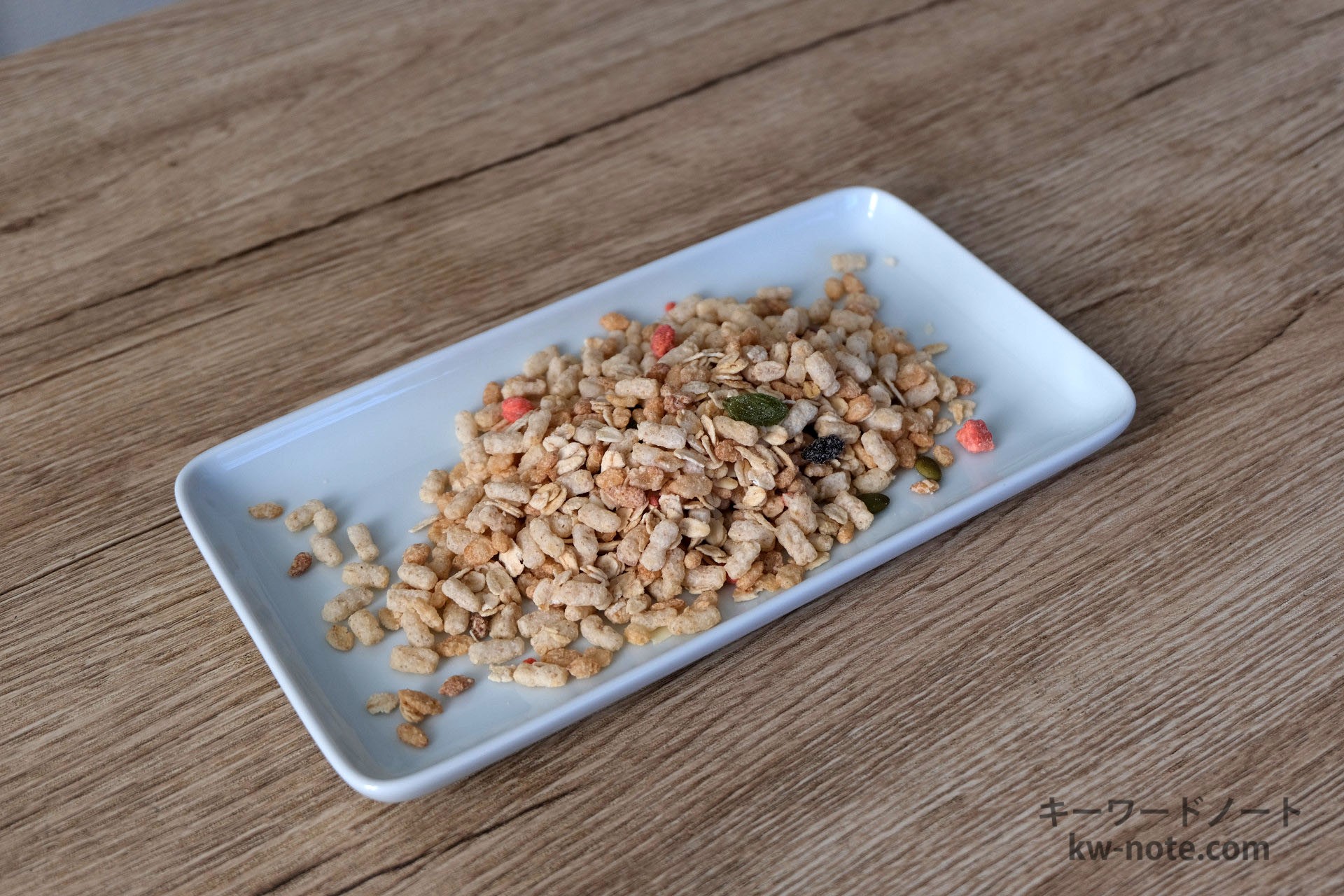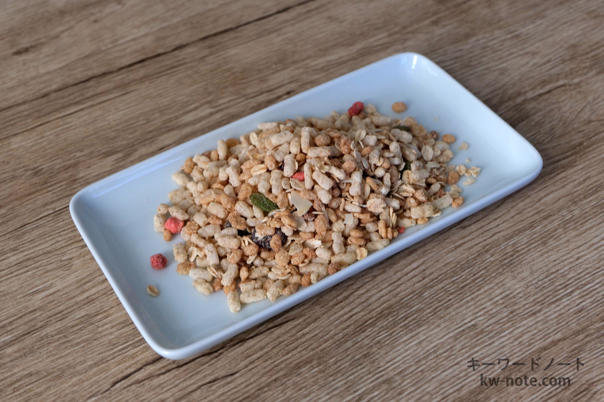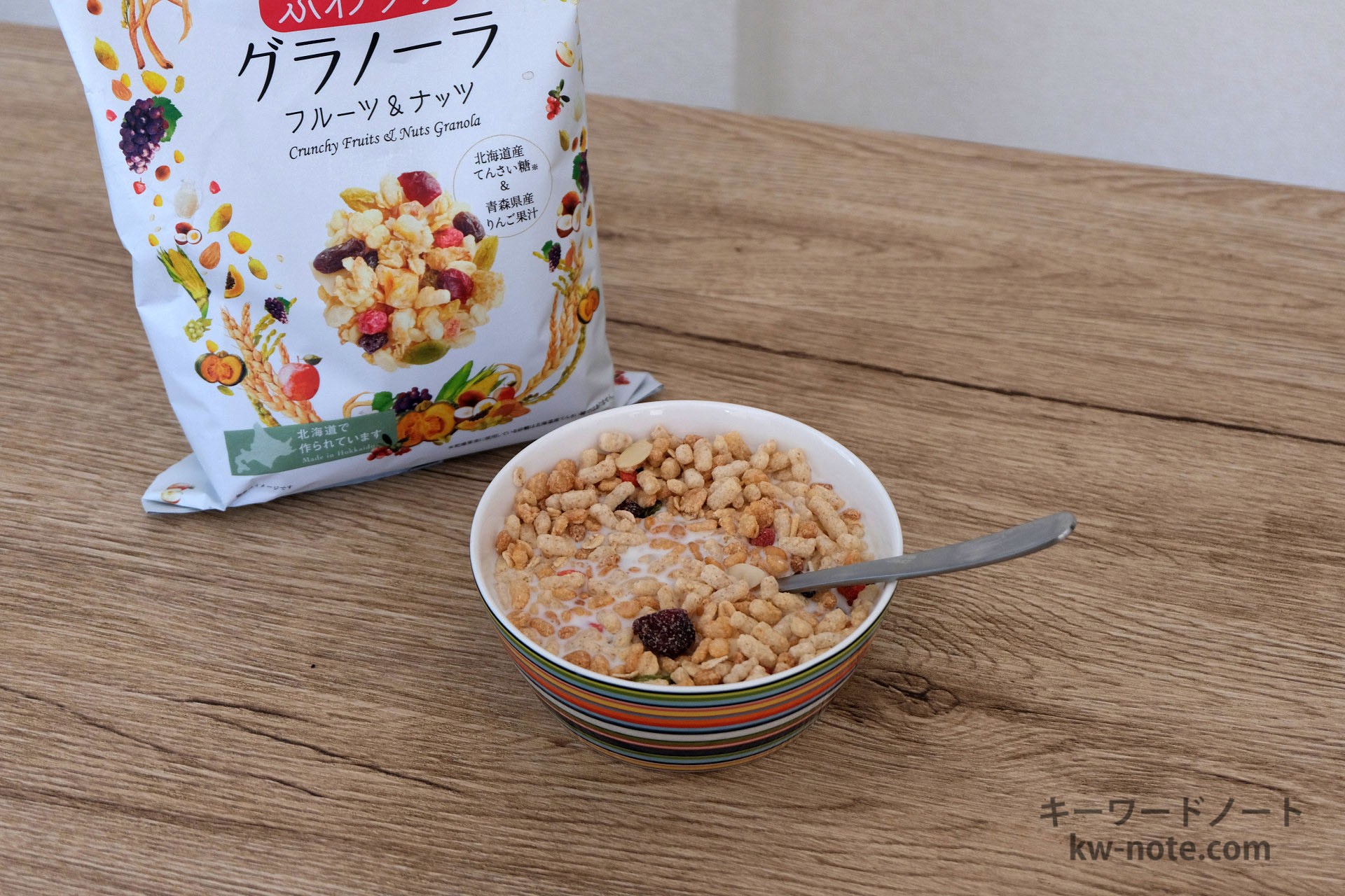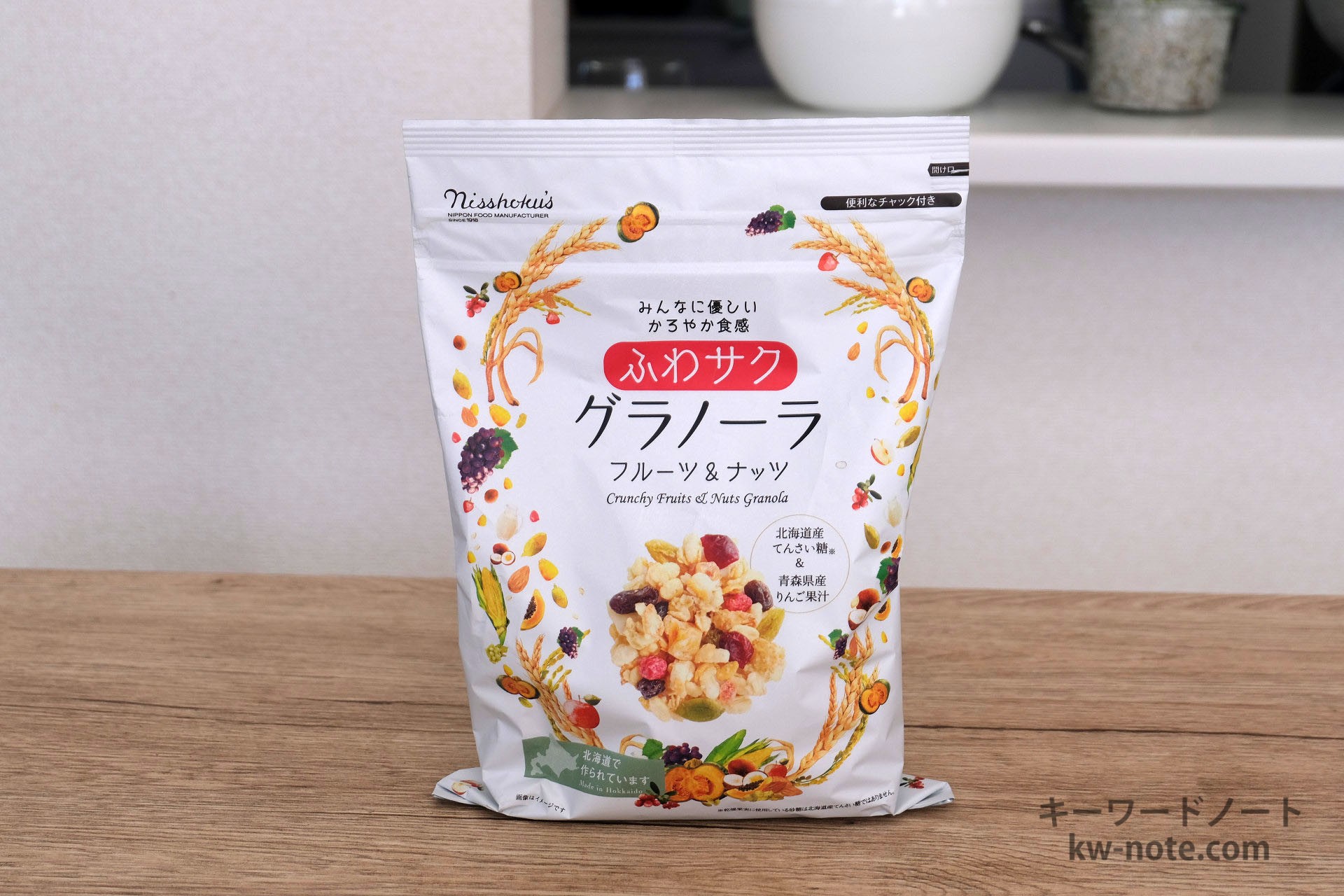 ふわサクグラノーラは名前の通りの食感で、他のフルーツ系のグラノーラに比べ穀物以外のフルーツやナッツが多く使われており美味しいです。