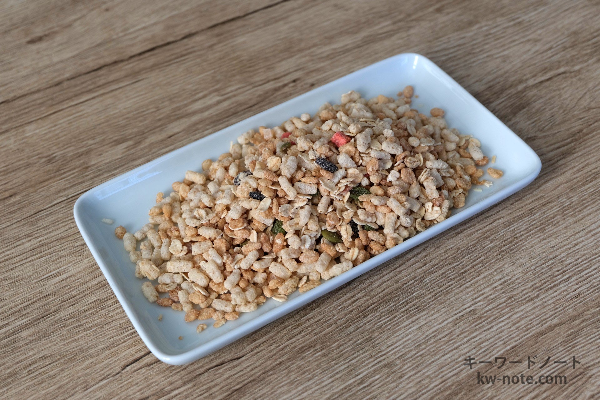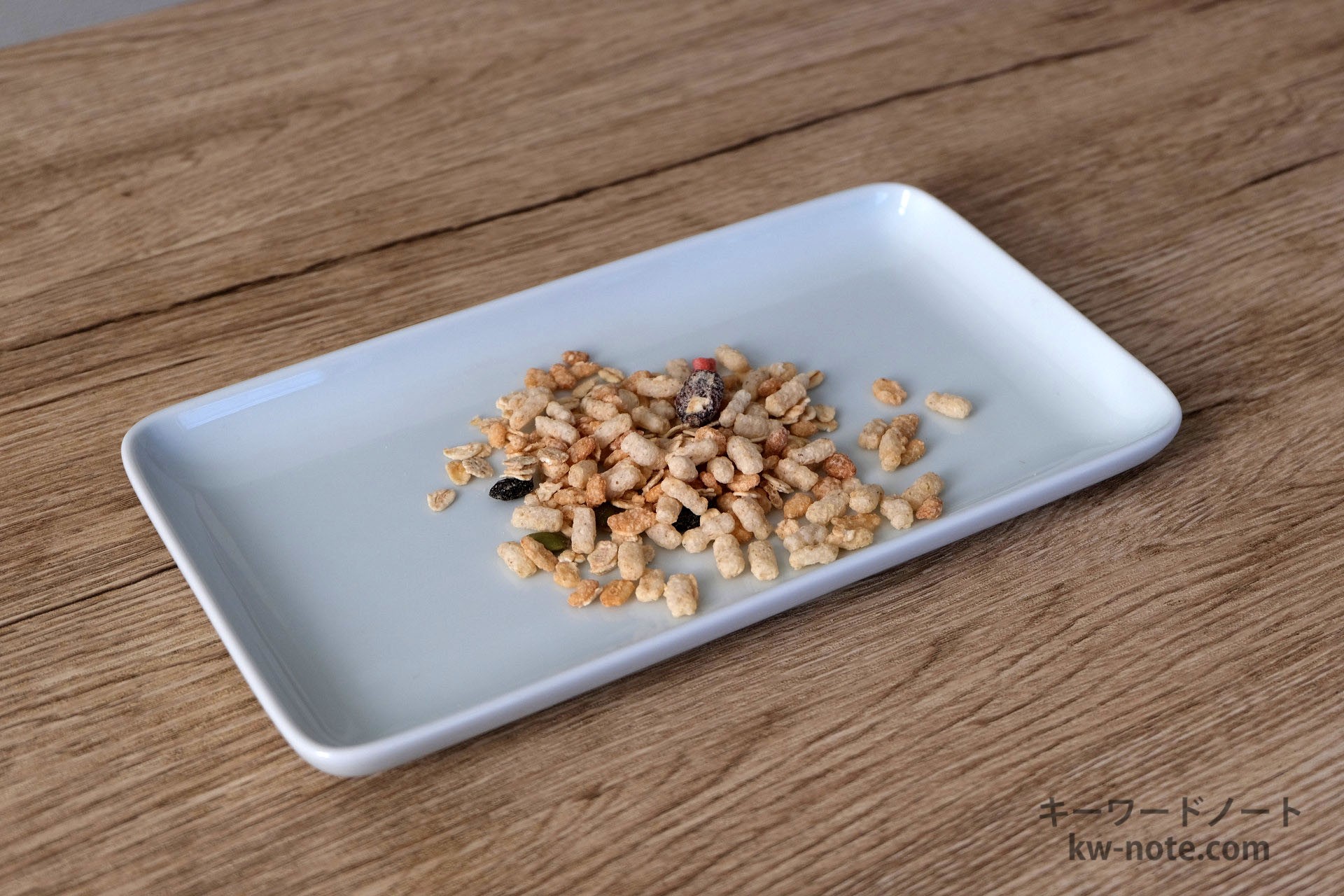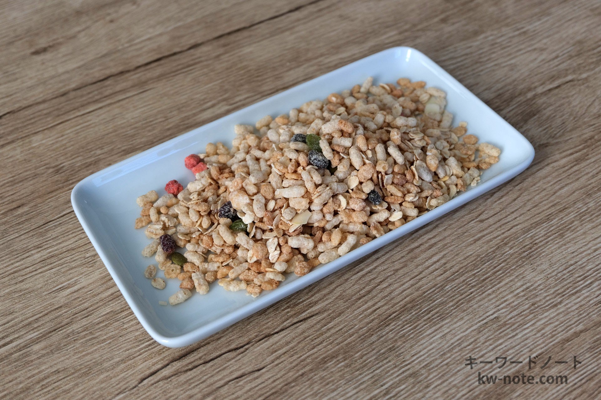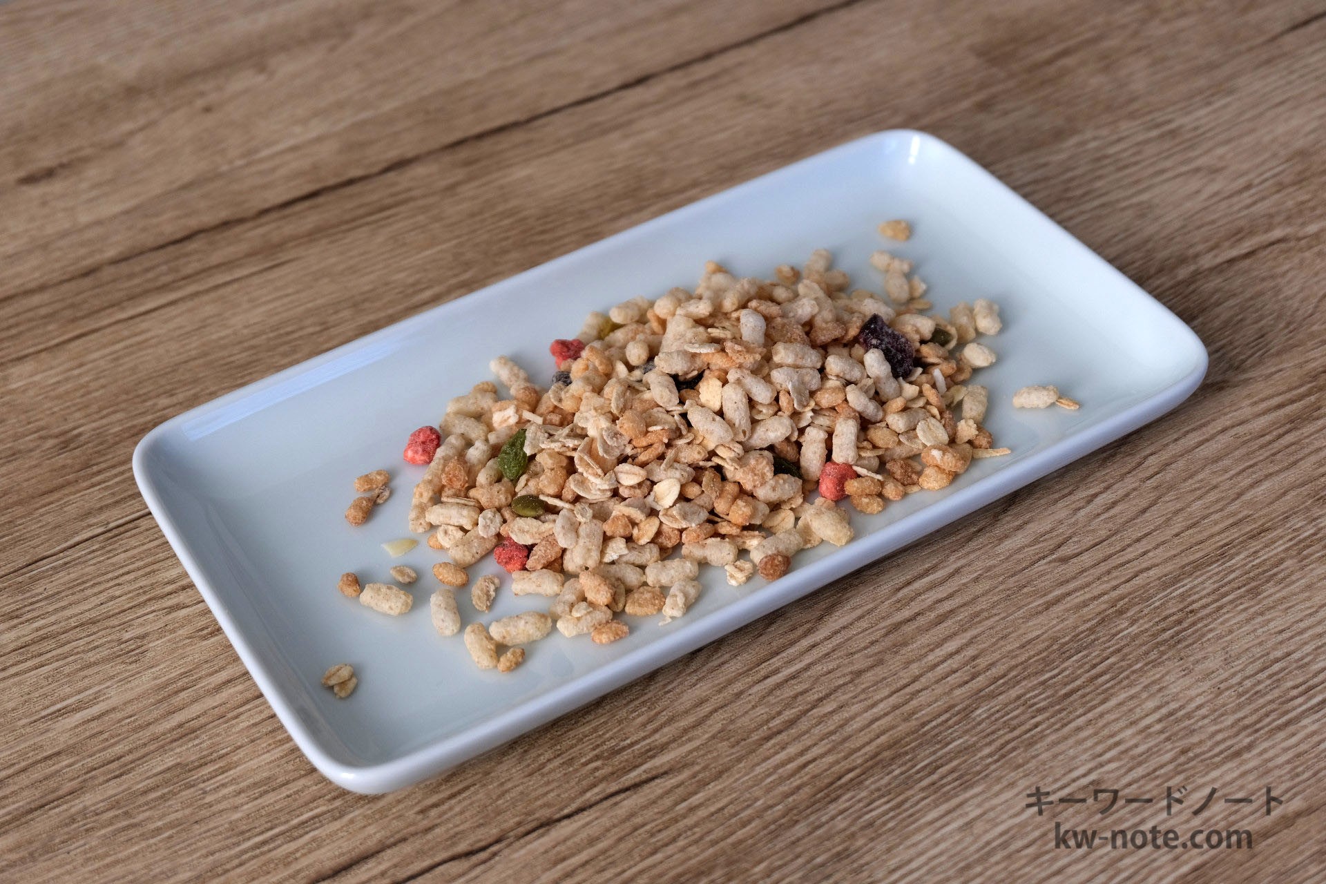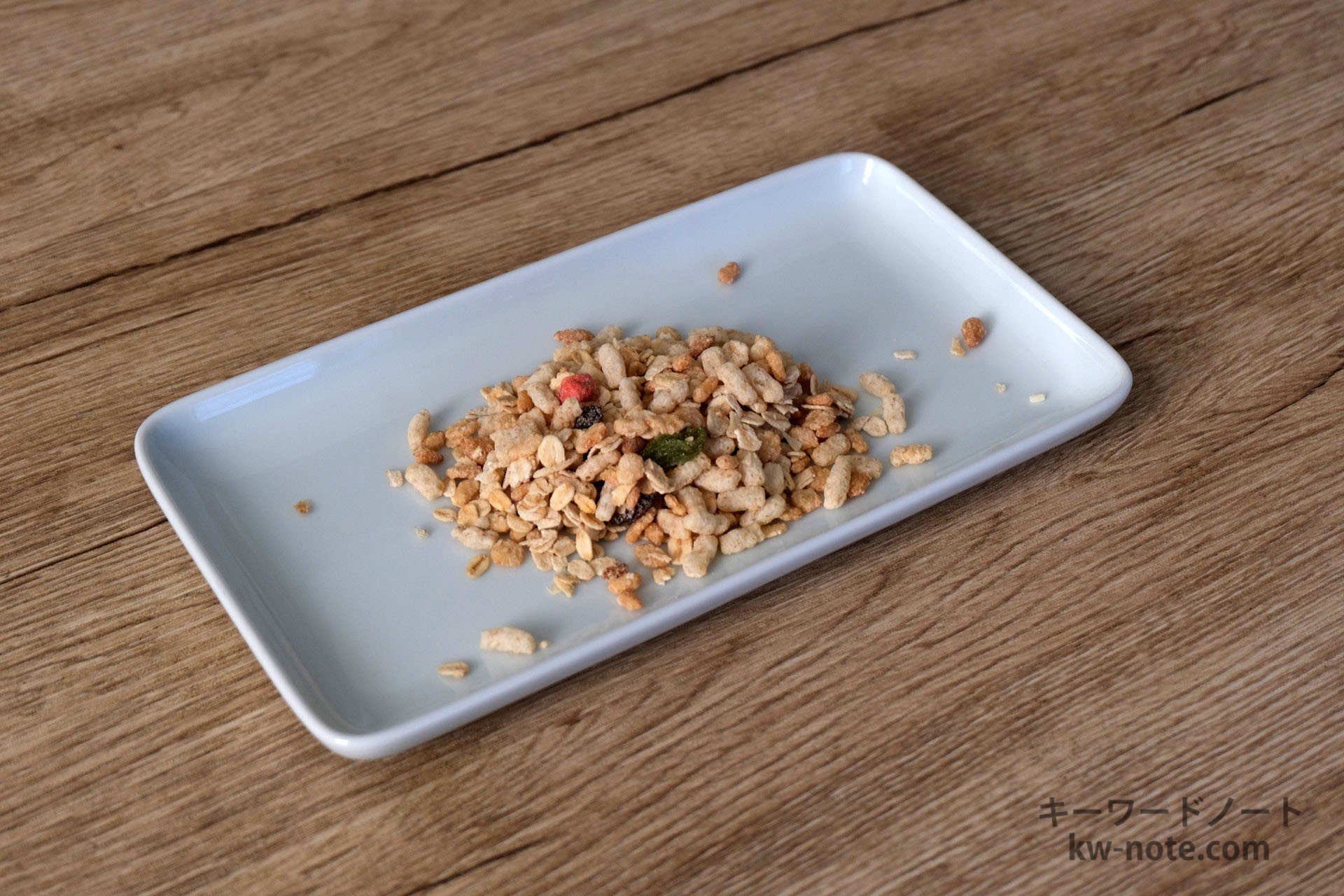 ふわサクグラノーラは名前の通りの食感で、他のフルーツ系のグラノーラに比べ穀物以外のフルーツやナッツが多く使われており美味しいです。