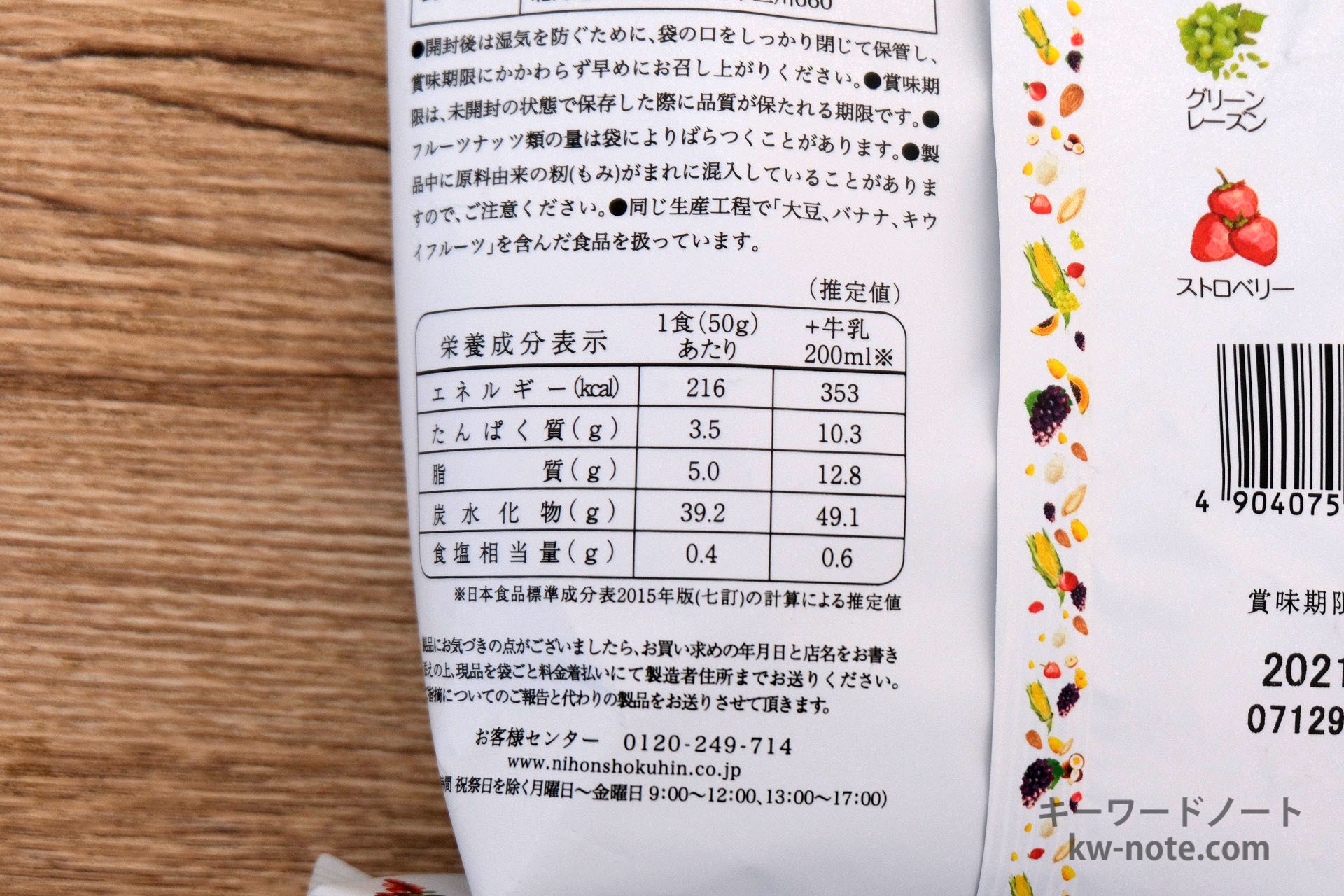 まず「ふわサクグラノーラ」1食分はどれくらいなのかというと、パッケージには「栄養成分表示 1食(50g)あたり」と書かれていますので、ふわサクグラノーラ フルーツ&ナッツは1食あたり50グラムが目安です。