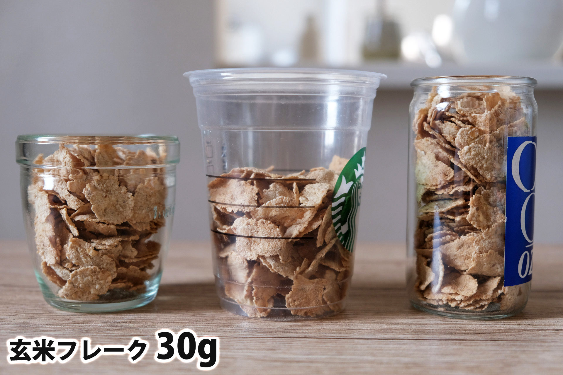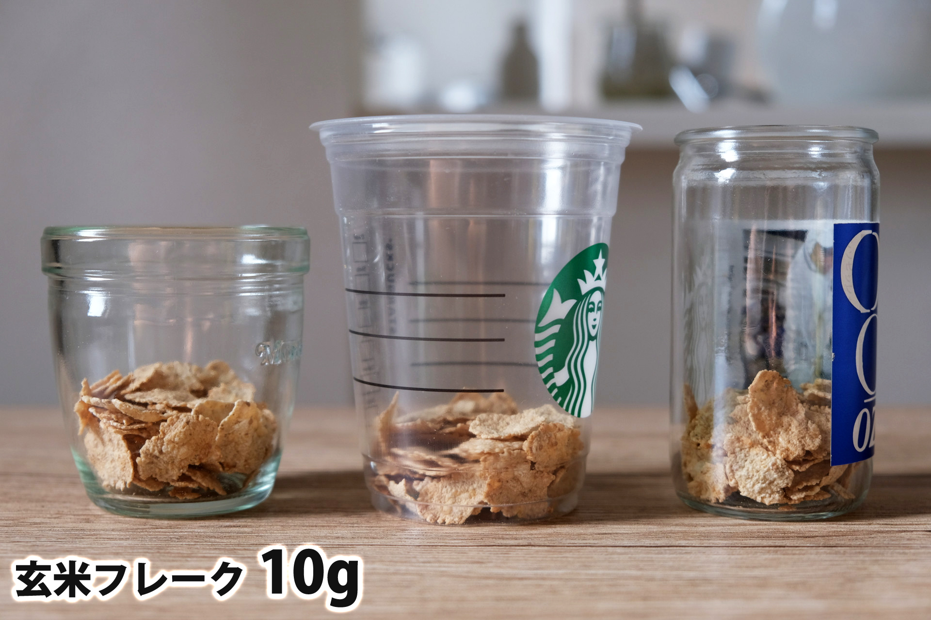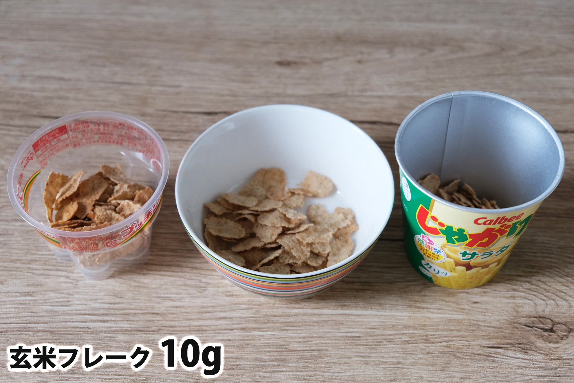ケロッグから発売されている「玄米フレーク」の食べる量を各グラムごとにわかりやすいよう、身近に見かける容器を使って視覚化しました。