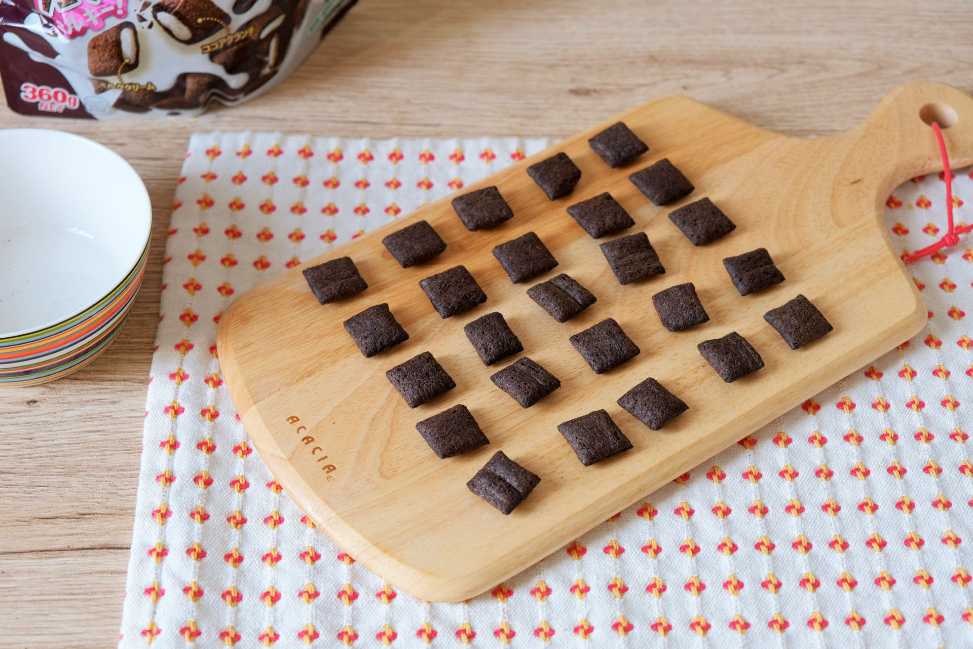 比較的新しい商品ですが、多くのスーパーで見かける位の人気商品のようで、今回撮影で使ったのはチョコビッツの「ミルキークリーム」ですが他にも「とろけるチョコレート」「抹茶ホワイトチョコレート」などがあります。