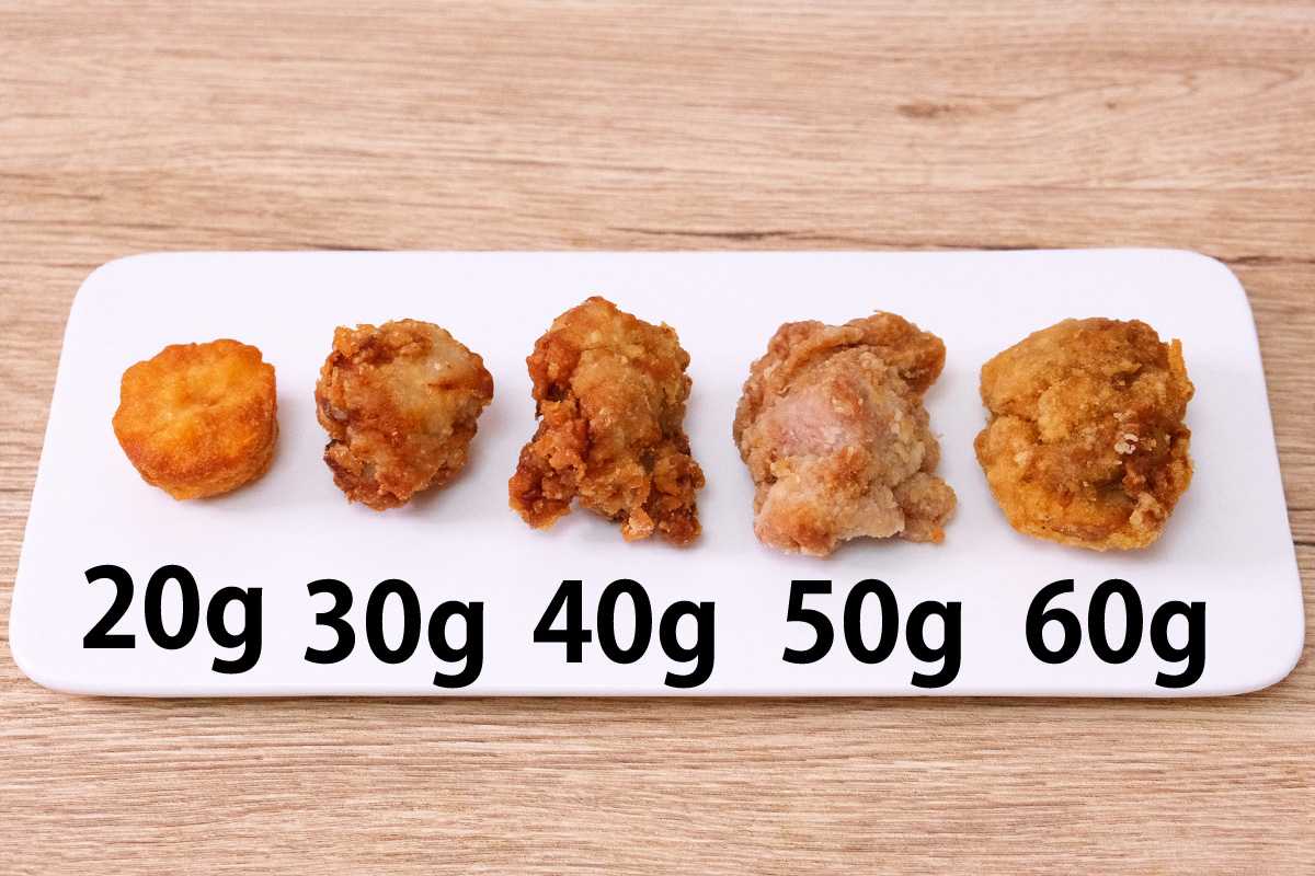 「から揚げ〇〇グラム」と言われても具体的にどんなものなのかあまりイメージが湧きづらいかと思います。