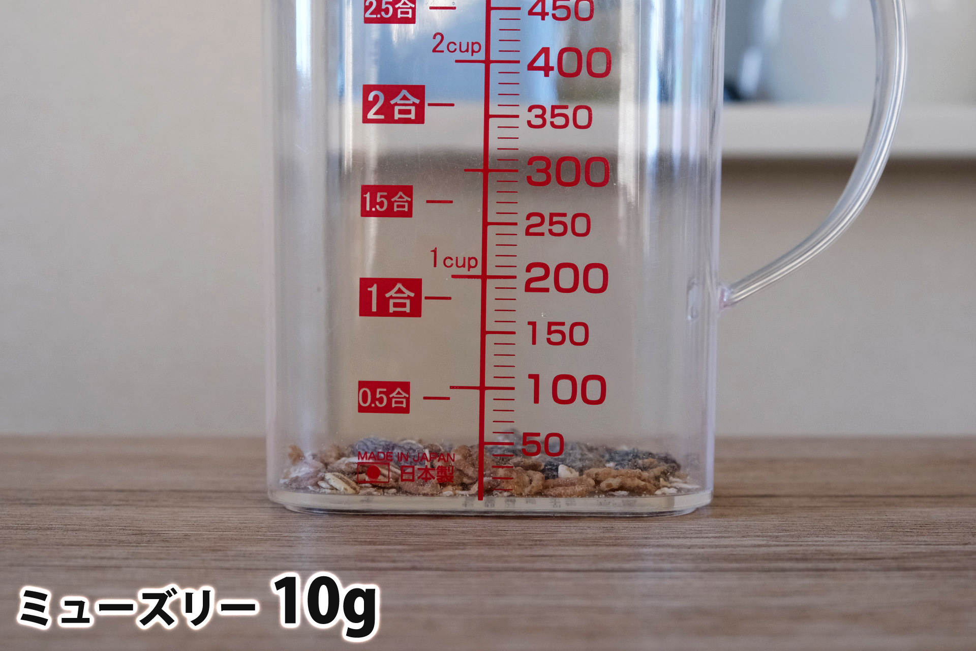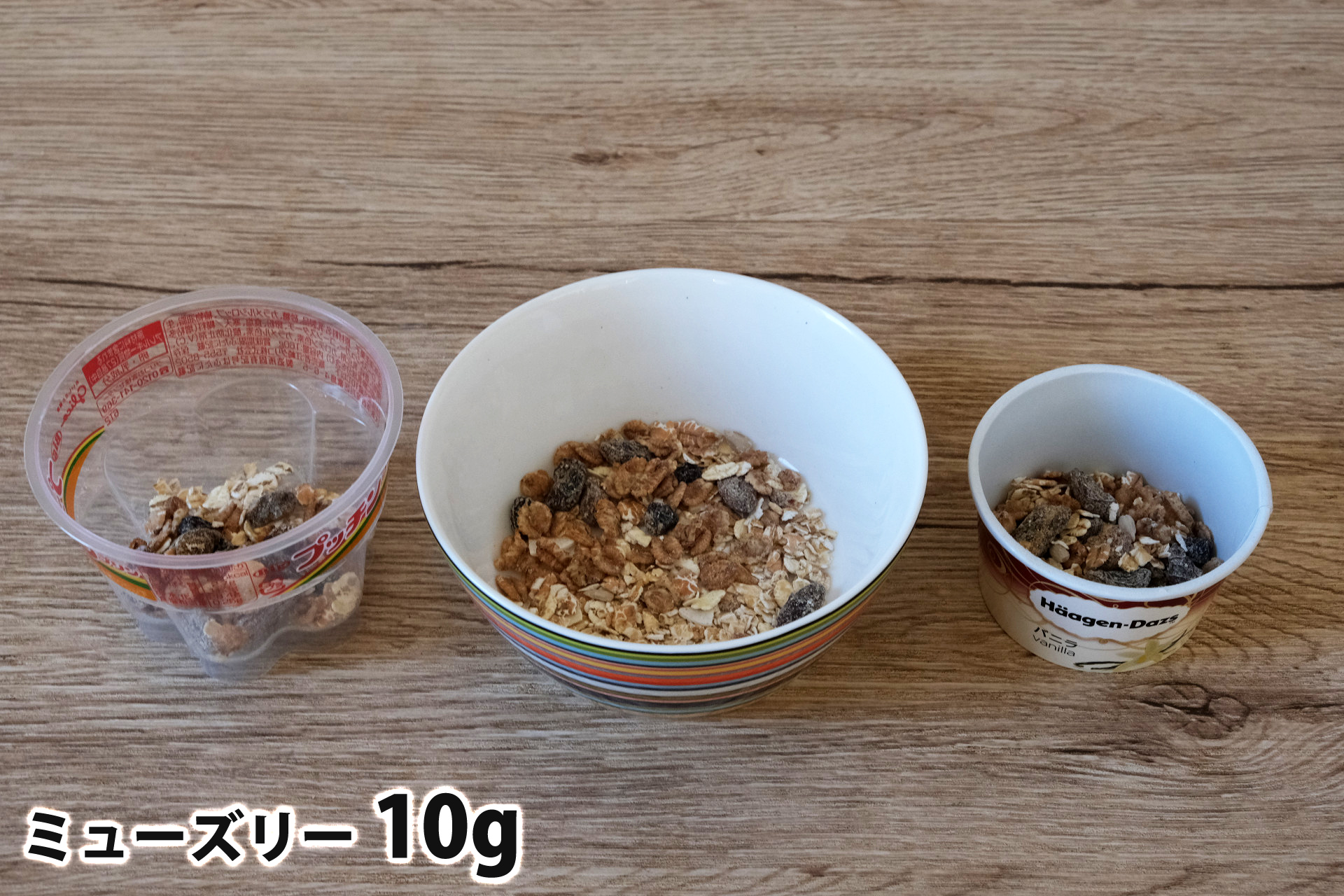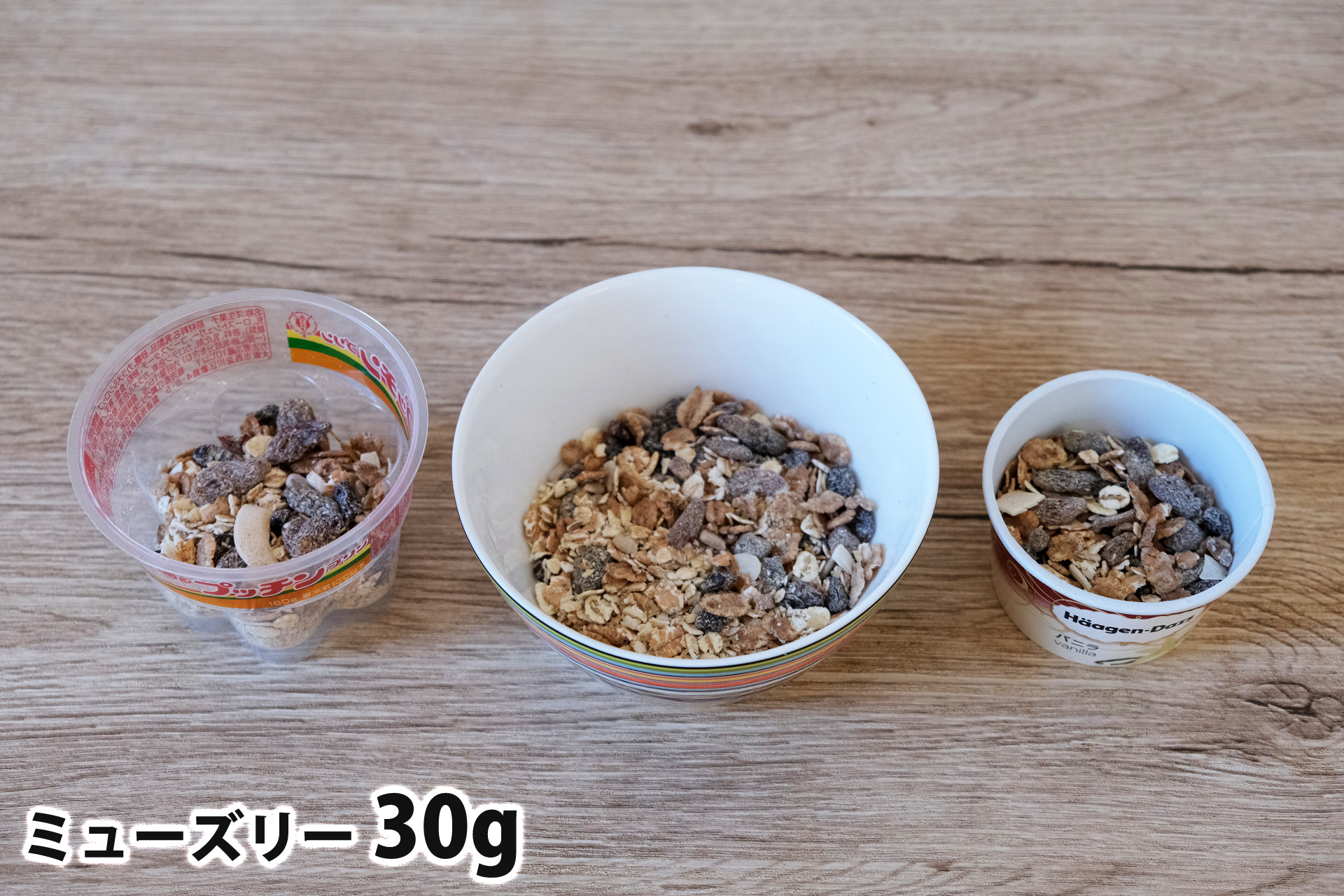 ミューズリー1食分の量はどれ位の量なのかと、グラムごとの分量の目安、牛乳・ヨーグルト・豆乳をかけた時の栄養成分をそれぞれまとめました。