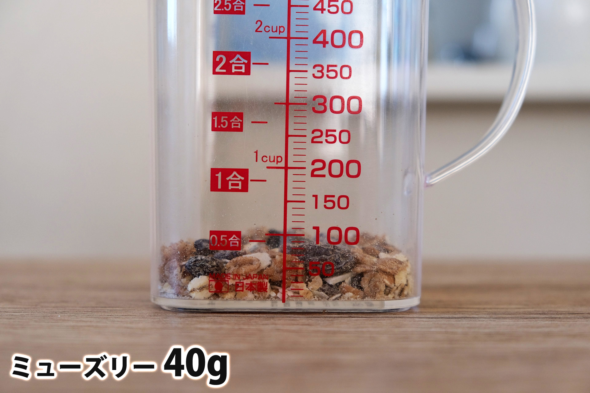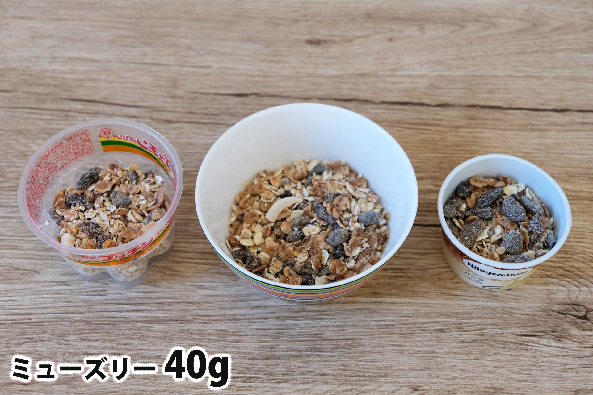 まずはミューズリー1食分ですが、40~50gが目安となります。