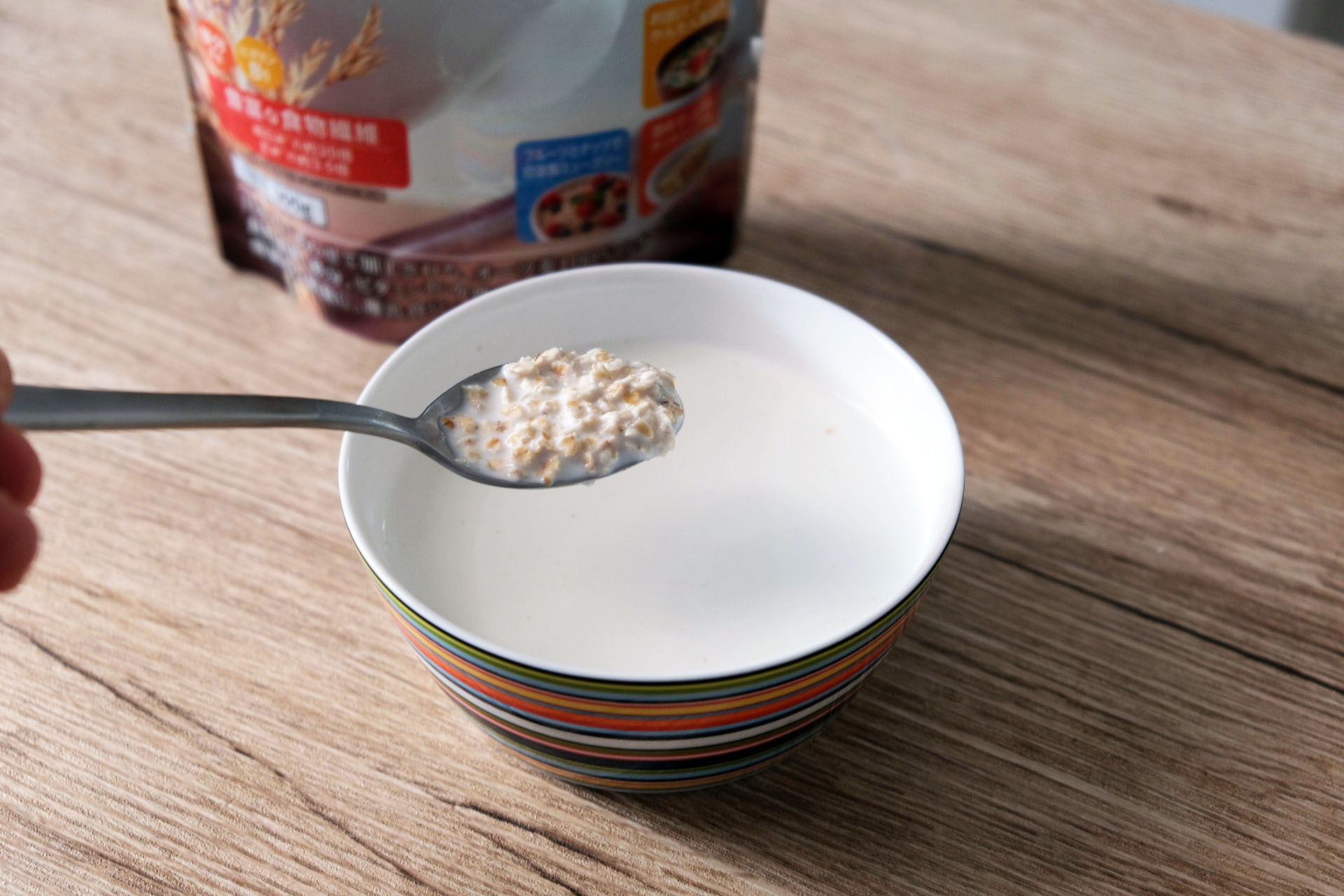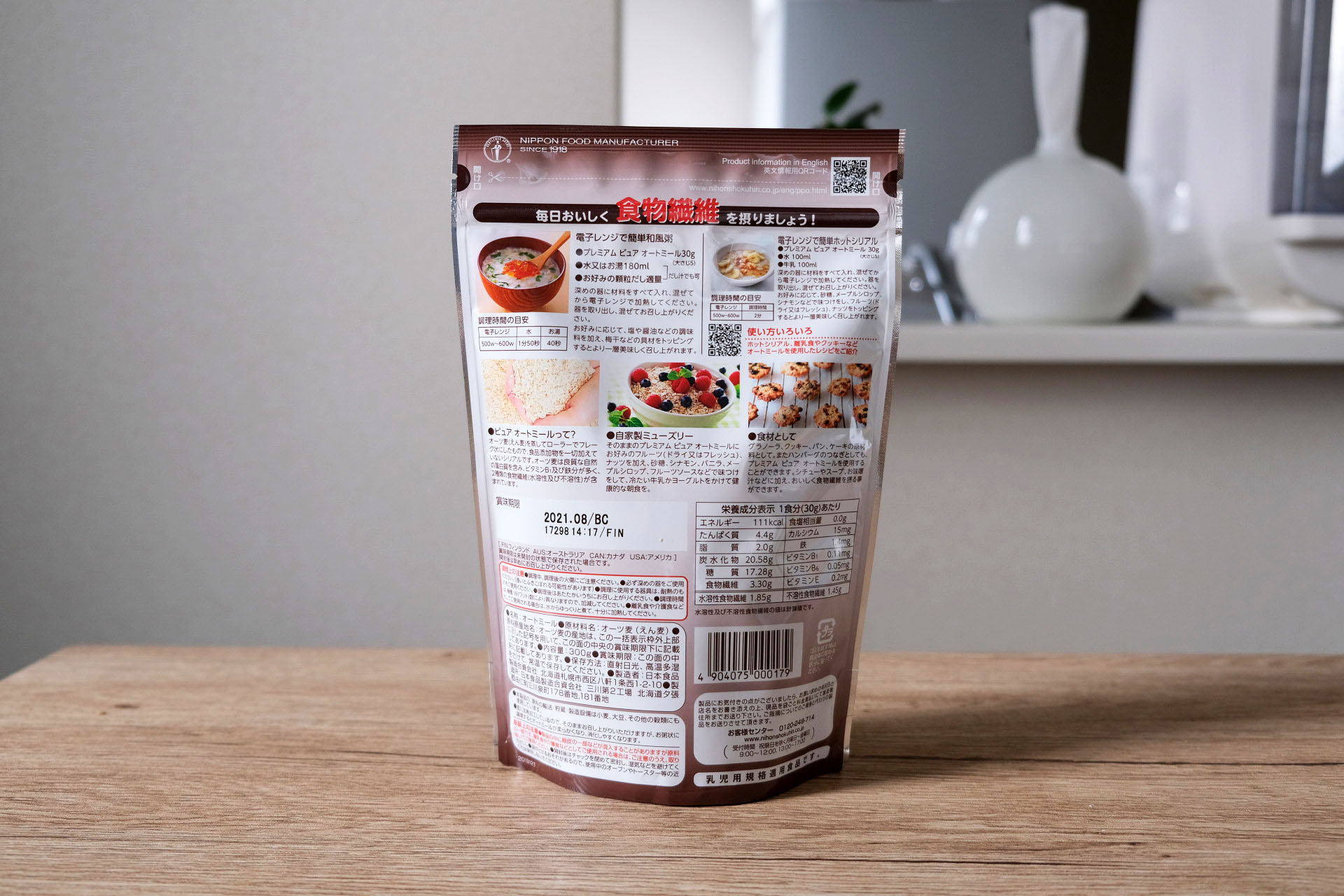 パッケージには「1食分(30g)あたり」と書かれていますので、日食のオートミールは1食30グラムという事になりますが、他の有名メーカーの表示を見ると40gが多いです。