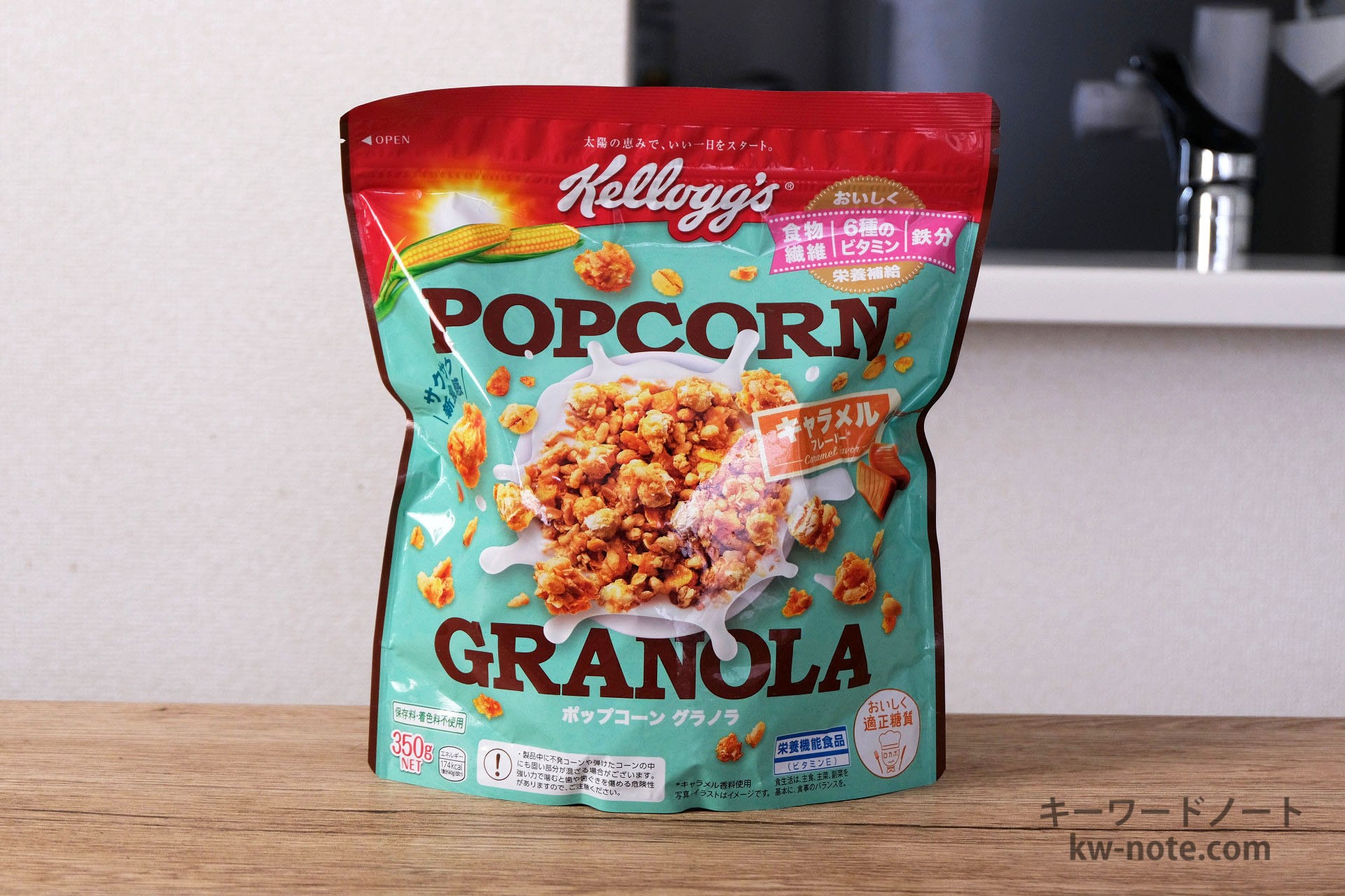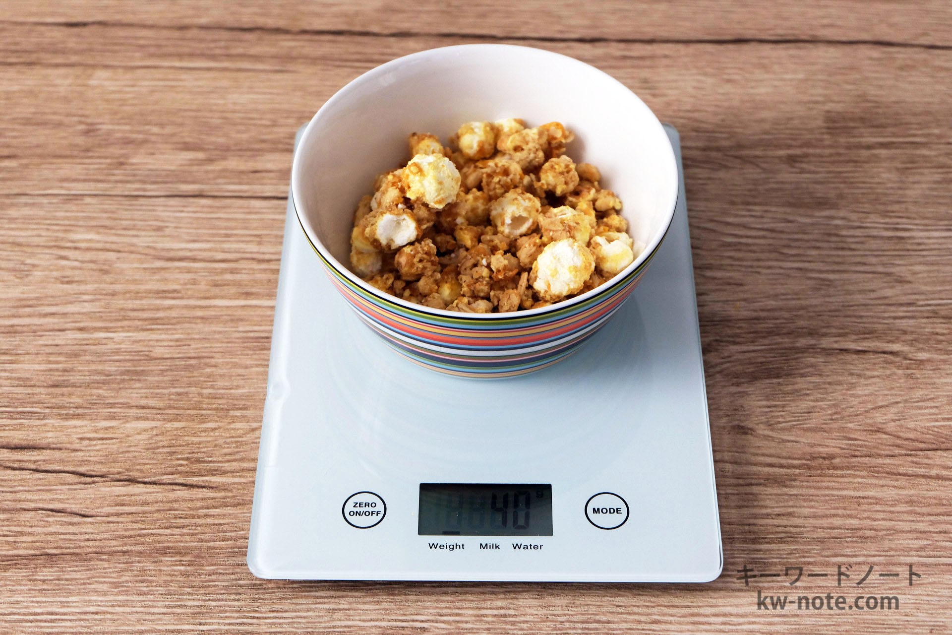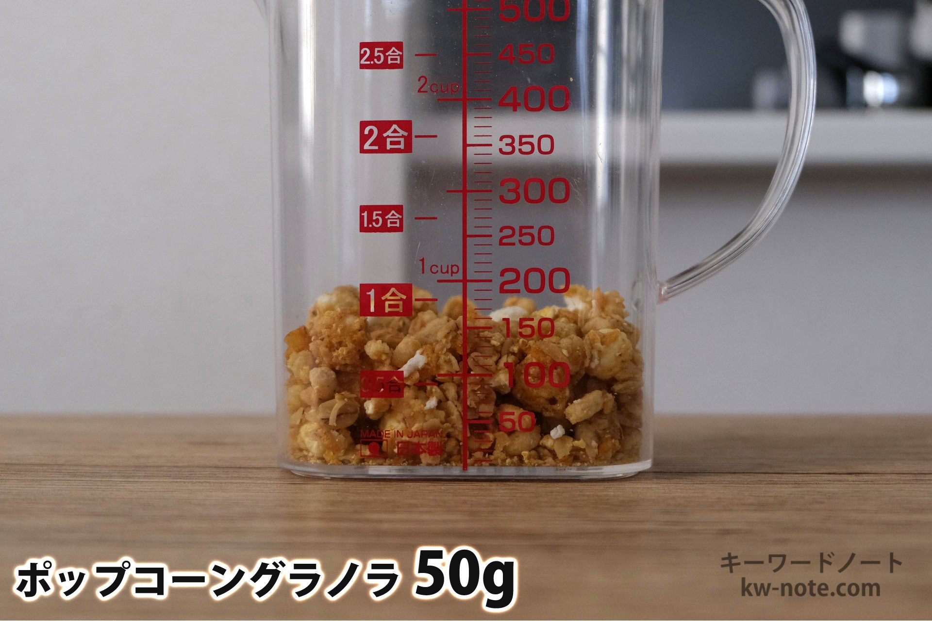ケロッグから販売されている「ポップコーングラノラ」1食分の量はどれ位なのかと、各グラムごとの分量の目安、牛乳・ヨーグルト・豆乳をかけた時の栄養成分とともにまとめました。