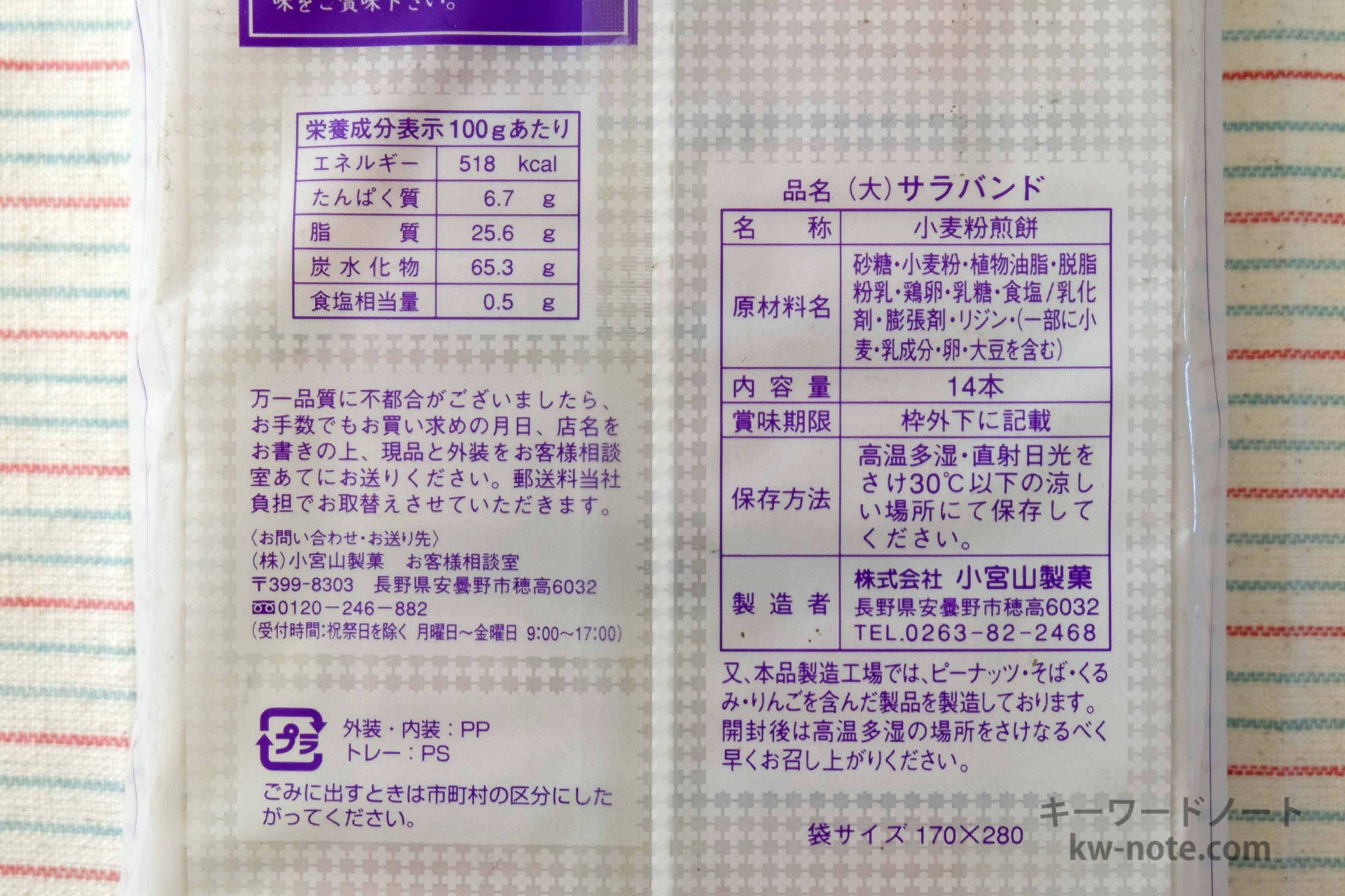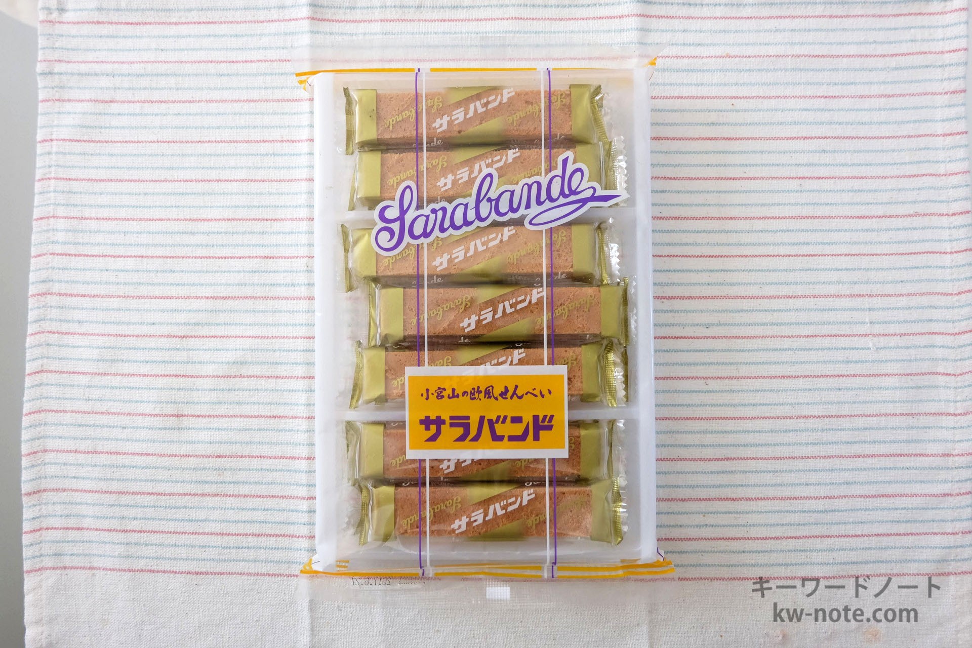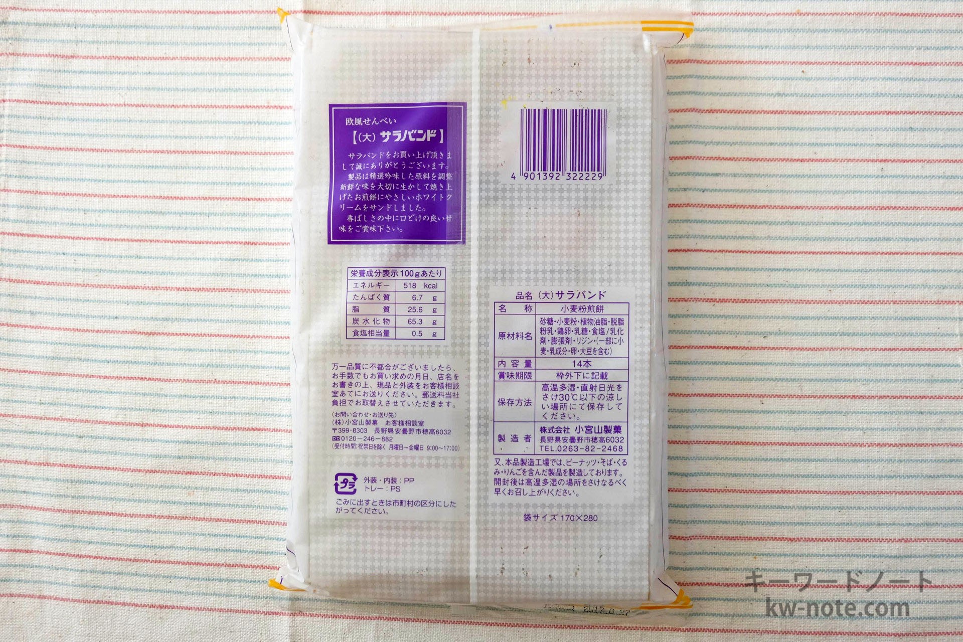 小宮山製菓公式サイトではサラバンドの説明として、小麦粉・砂糖・卵などの厳選された原料を北アルプスの清水で練り上げ、焼き上がったせんべいにクリームをサンドした「欧風せんべい」と表現しています。
