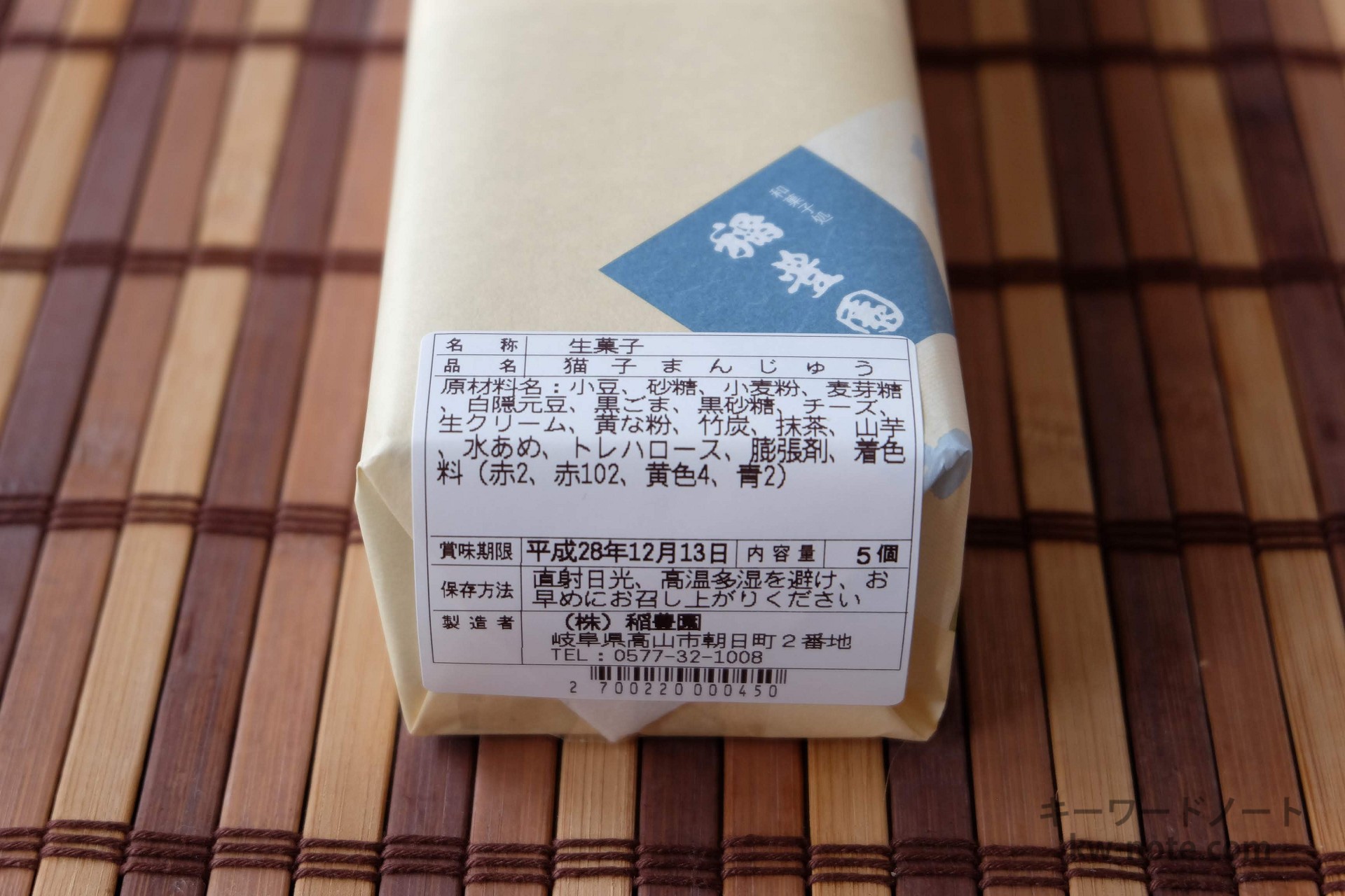 | 原材料名 | 小豆、砂糖、小麦粉、麦芽糖、白隠元豆、黒ごま、黒砂糖、チーズ、生クリーム、黄な粉、竹炭、抹茶、山芋、水あめ、トレハロース、膨張剤、着色料(赤2、赤102、黄色4,青2) |