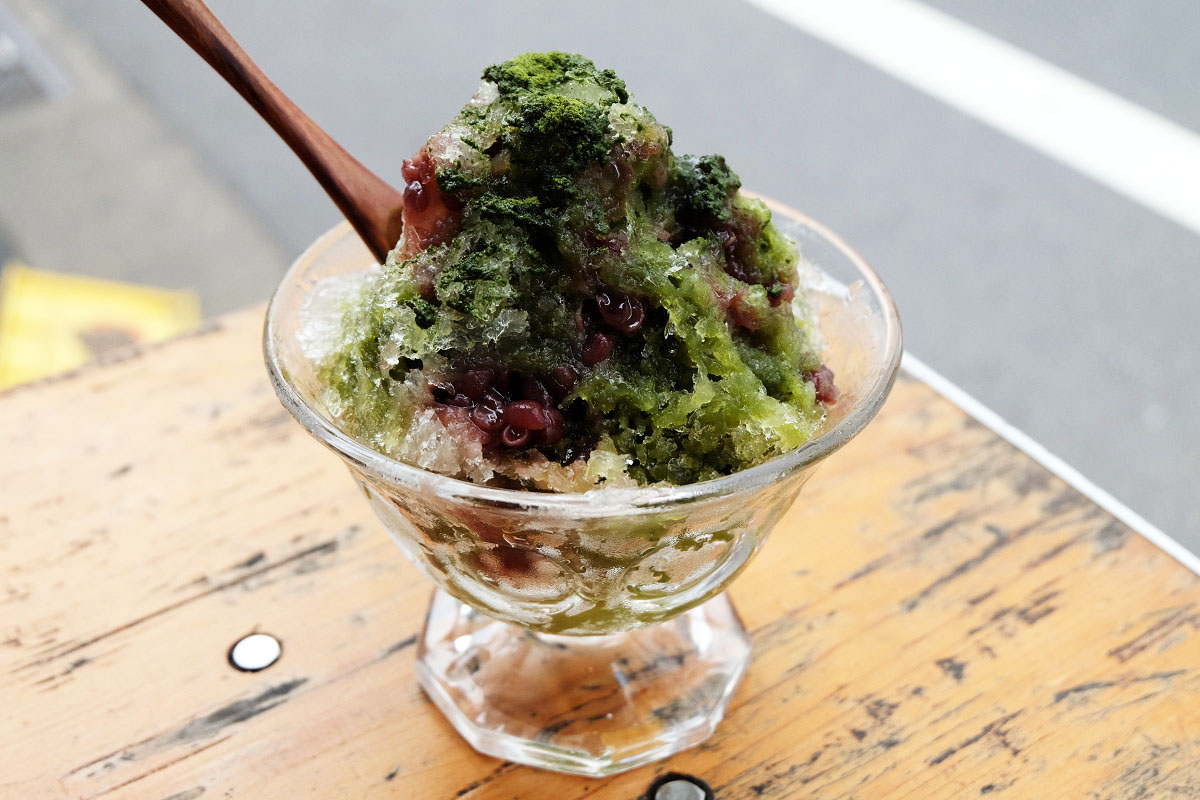 「宇治金時」は抹茶に水と砂糖を加えたシロップに、小倉餡をのせたかき氷です。