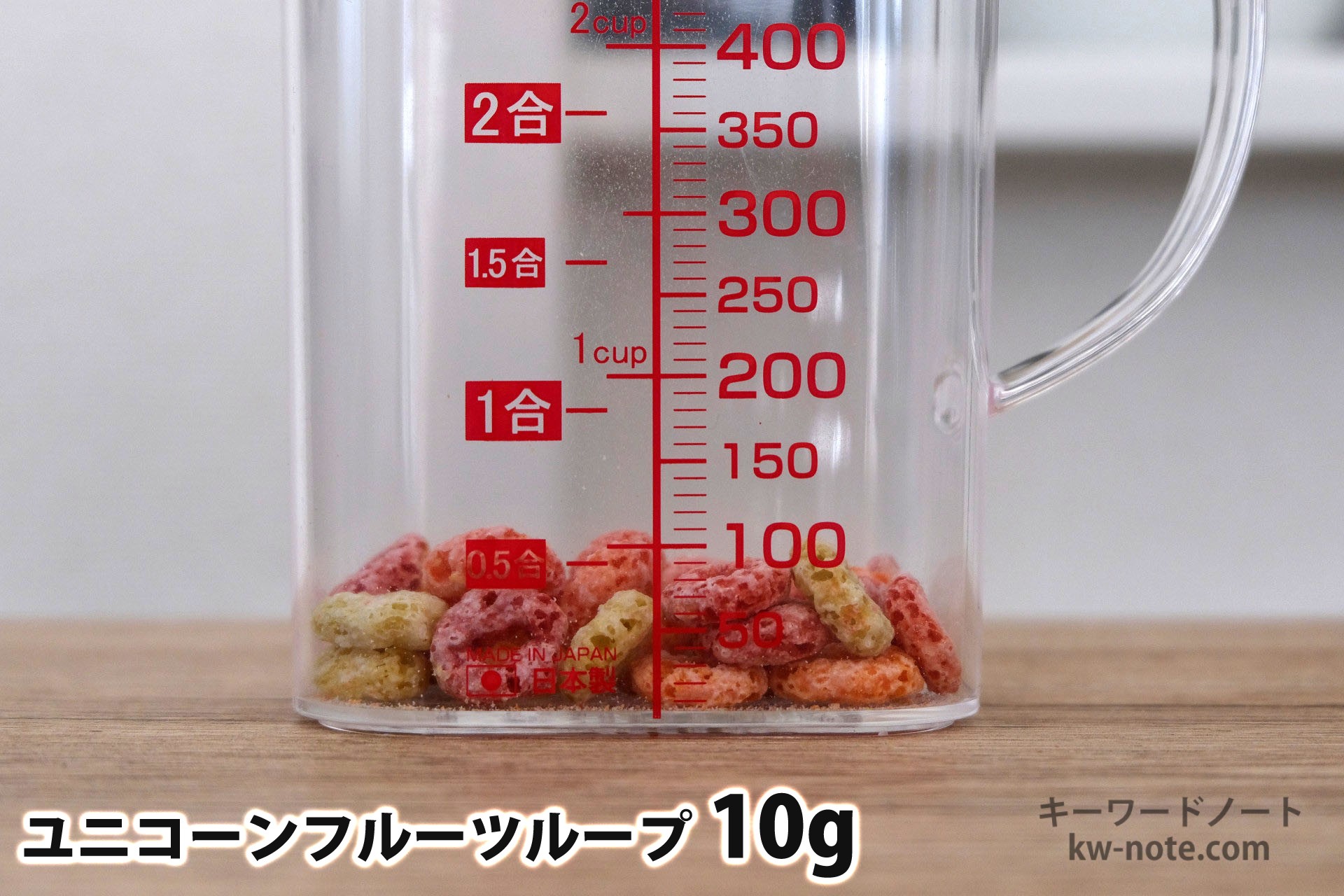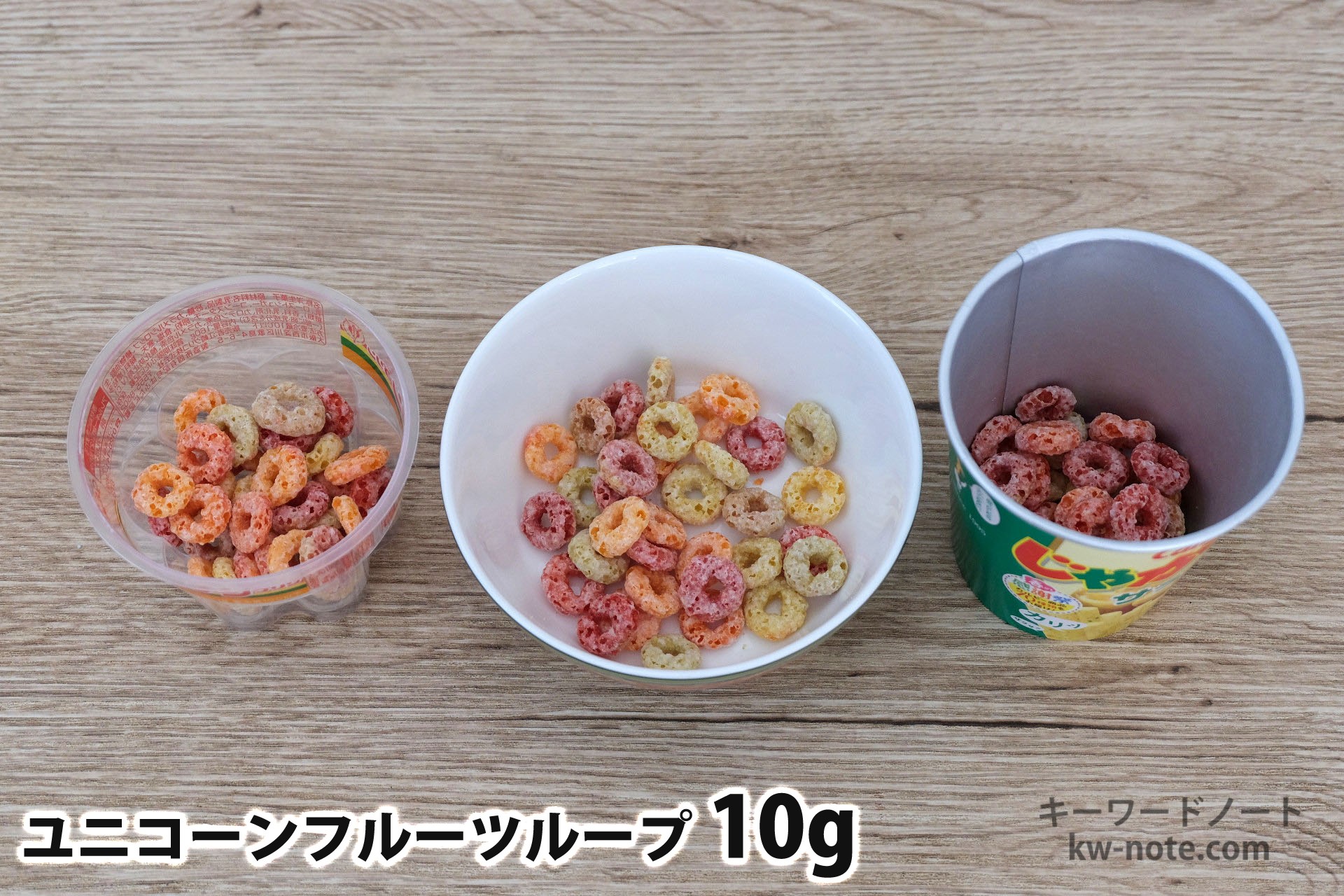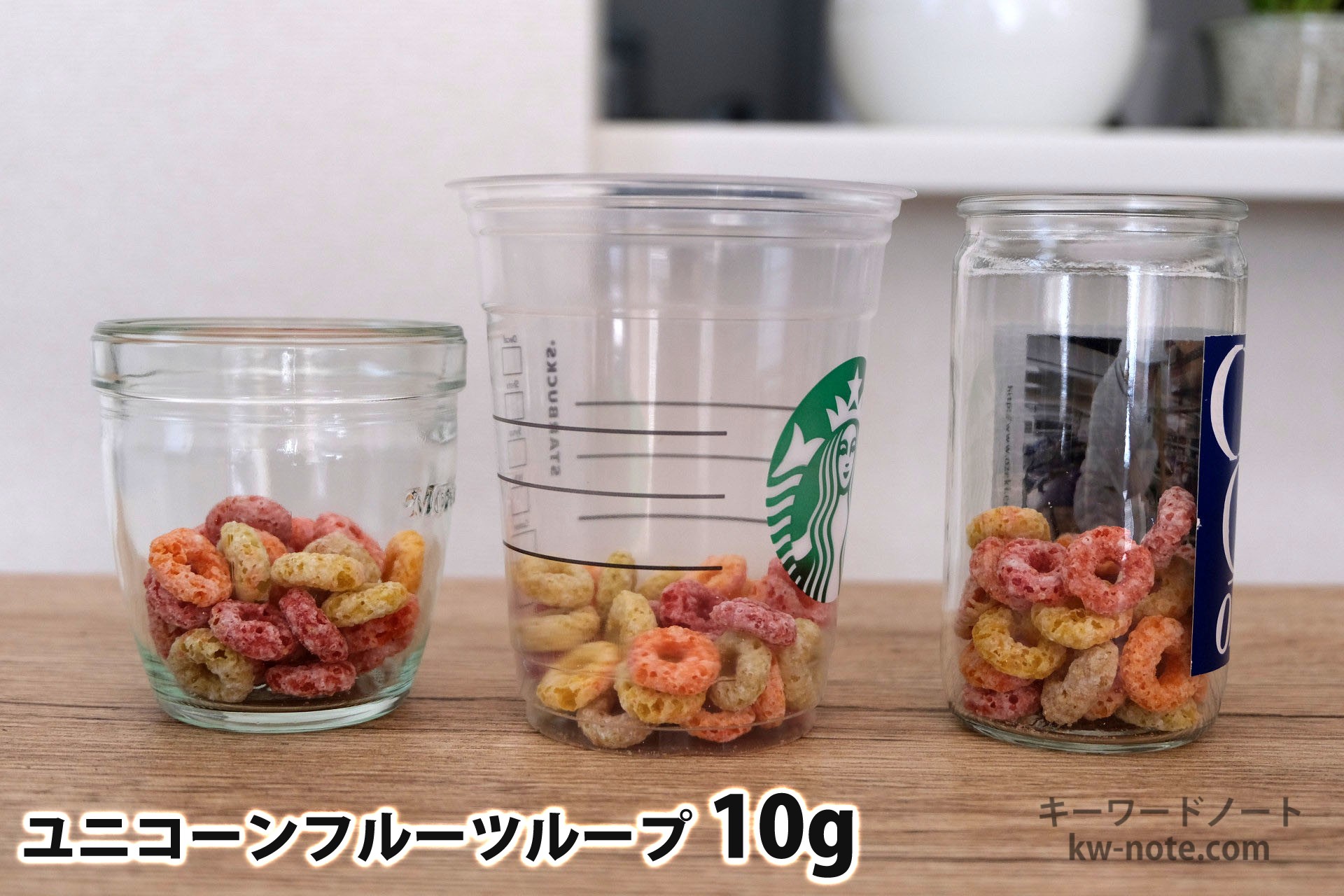 • ユニコーンフルーツループ10gを「モロゾフ」「トールサイズのカップ」「ワンカップ大関」に入れた時の目安