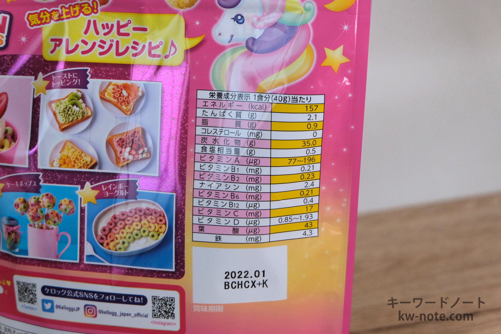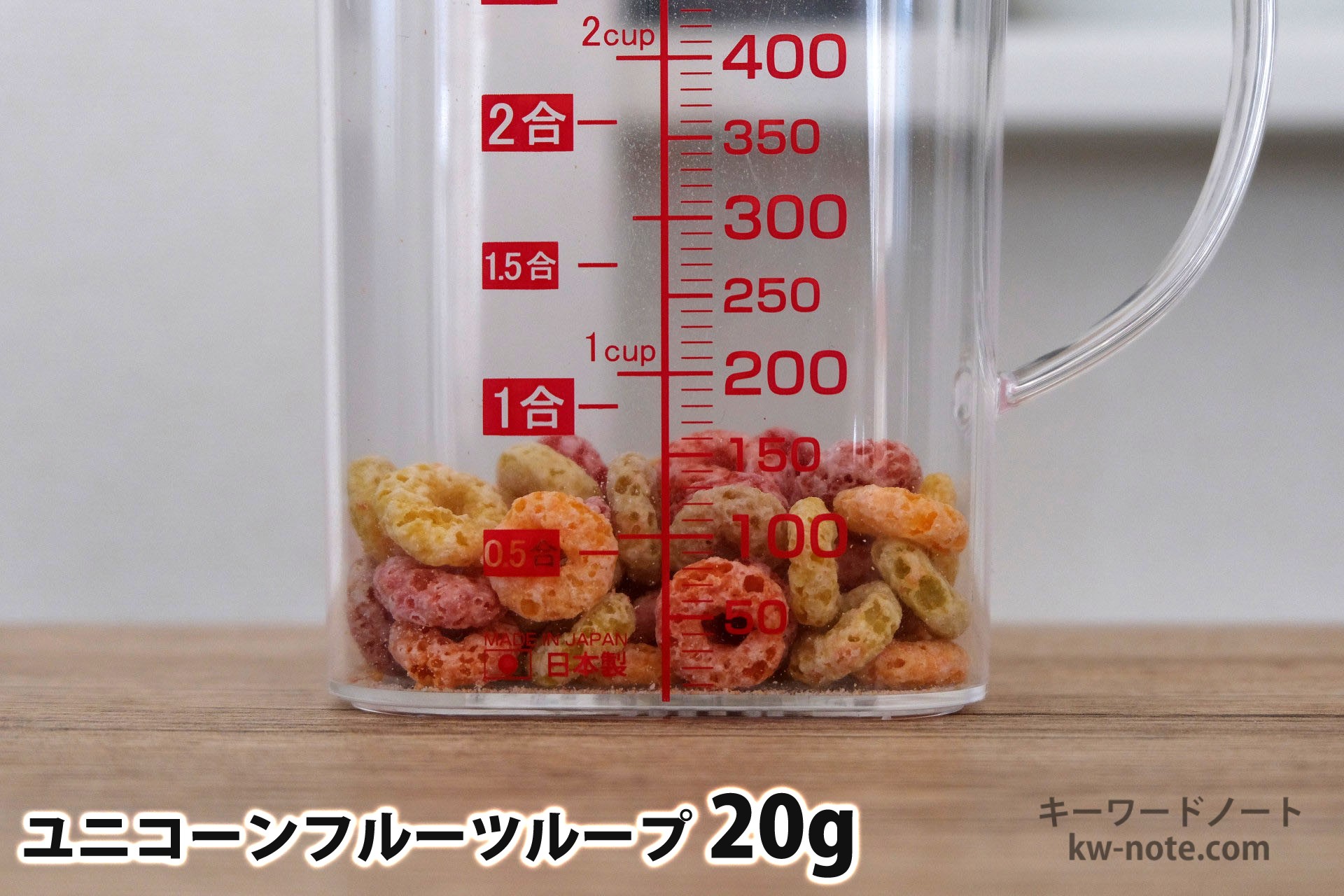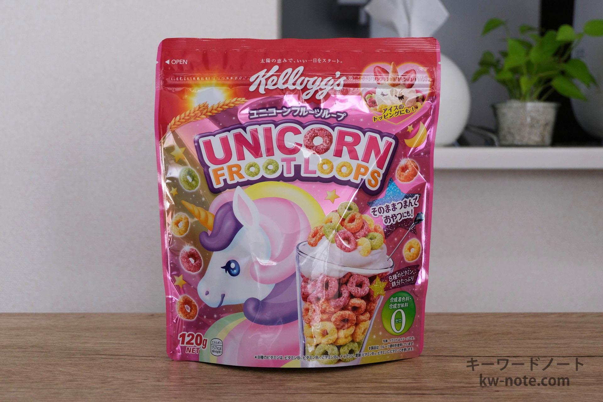 ケロッグから販売されている、色鮮やかなユニコーンカラーのシリアル「ユニコーン フルーツループ」1食分の量はどれ位なのかと、各グラムごとの分量の目安、牛乳・ヨーグルト・豆乳をかけた時の栄養成分とともにまとめました。