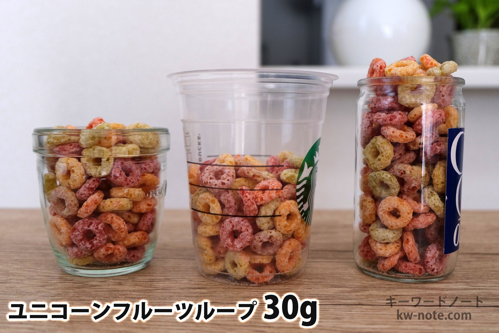 • ユニコーンフルーツループ30gを「モロゾフ」「トールサイズのカップ」「ワンカップ大関」に入れた時の目安