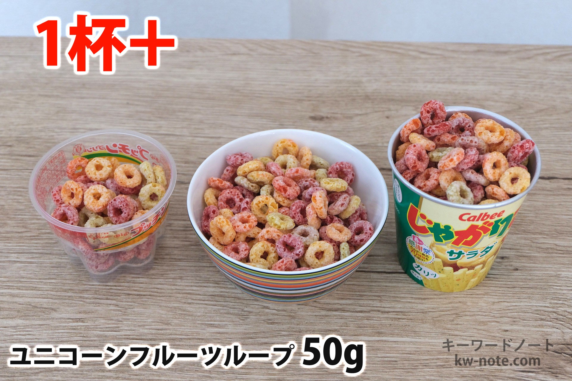 • ユニコーンフルーツループ50gを「Bigプッチンプリン」「250mlボウル」「じゃがりこ」に入れた時の目安
