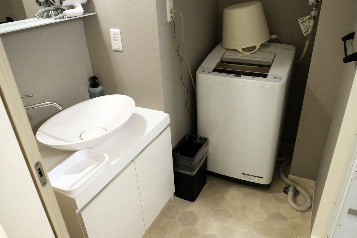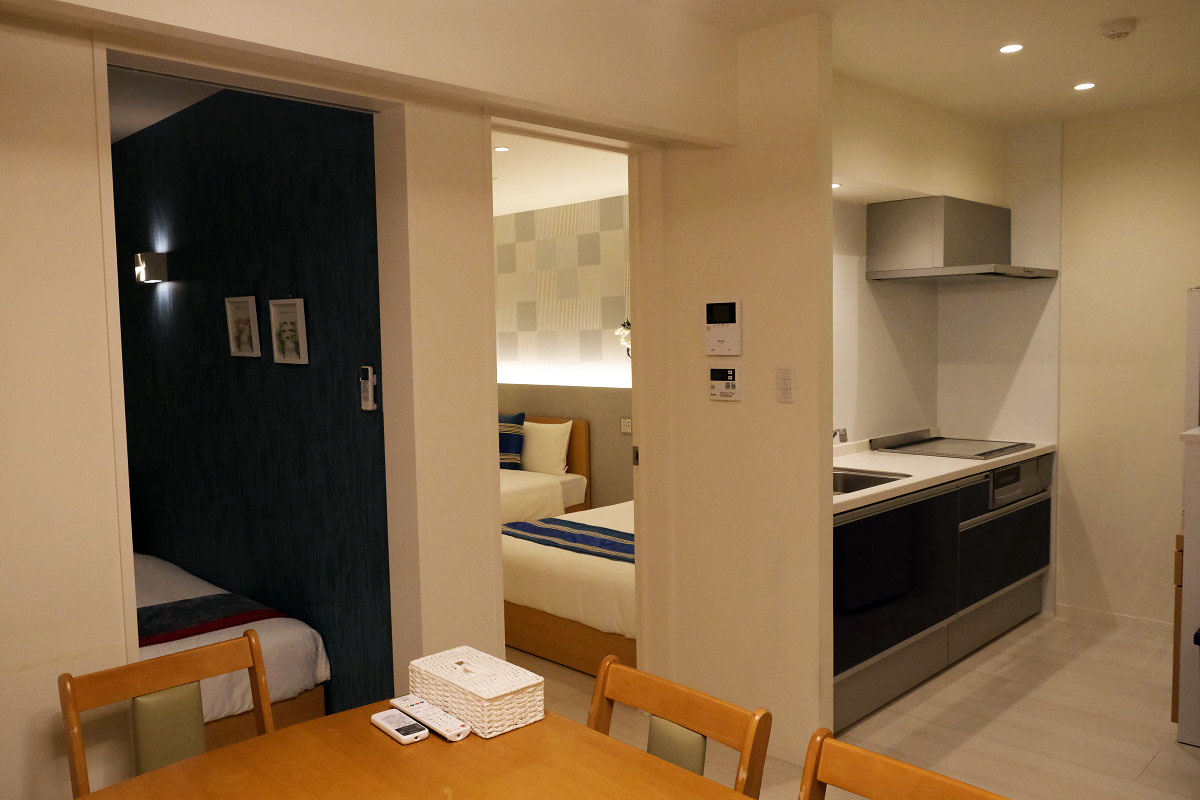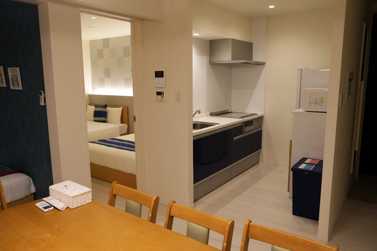 天神南駅から徒歩6分ほどの場所にあり、キッチンや洗濯機なども設置されているアパートメントホテルでした。