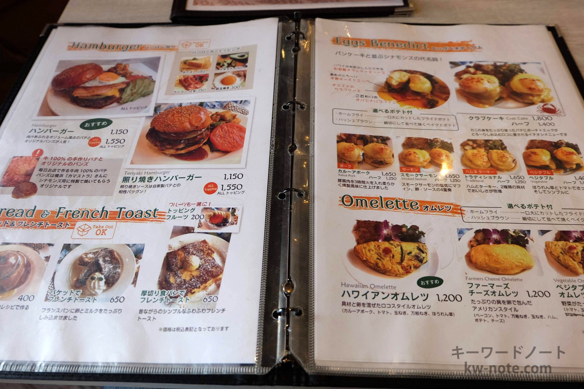 ハンバーガー、パン、フレンチトースト、エッグベネディクト
