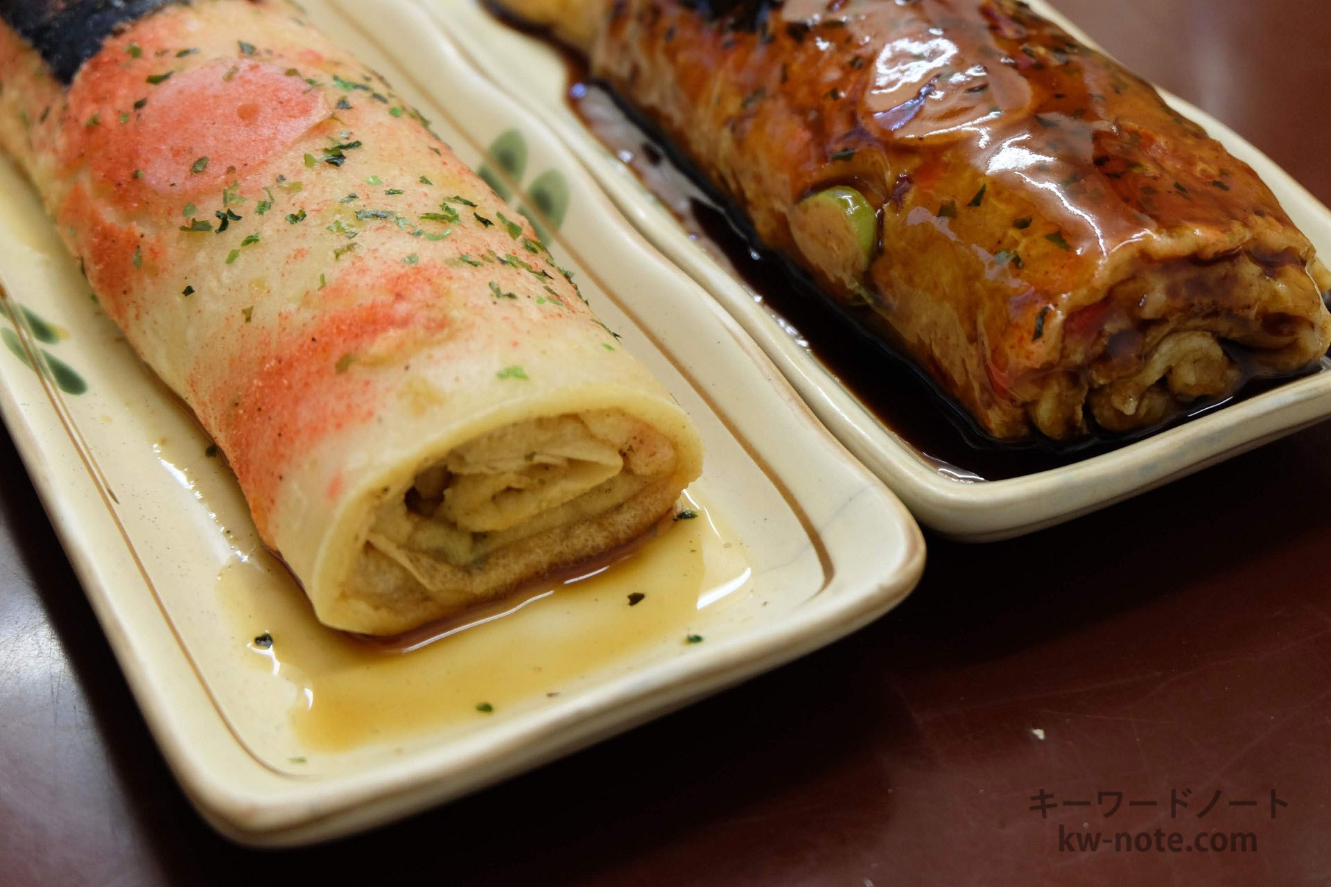ここおやつ屋さんでは、割りばしを串にして生地をロール状に巻いた形状で提供され、ソースと醤油を基本にチーズやカレーなど様々な味があります。