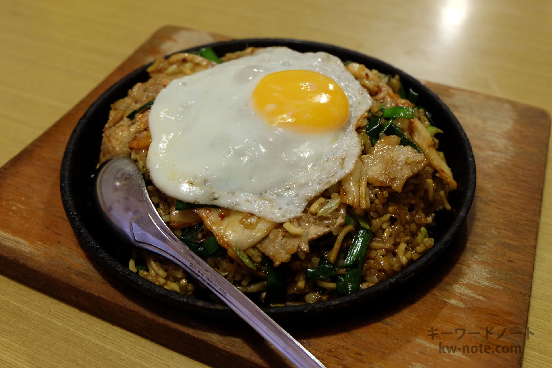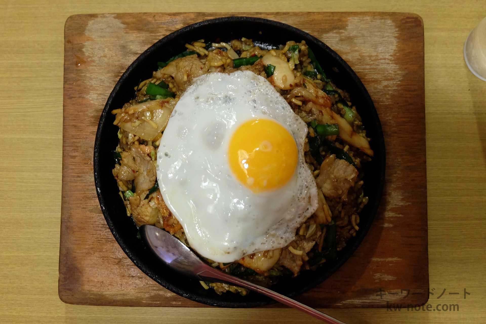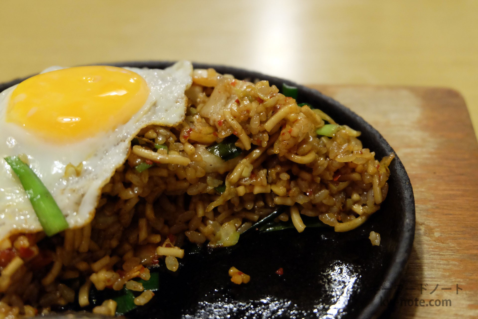 おすすめはスジとのことでしたが、注文したのは「そばめし スタミナ」で、ノーマルのそばめしは生卵が乗りますがスタミナは目玉焼きの他、豚肉・ニラ・キムチが加わっています。