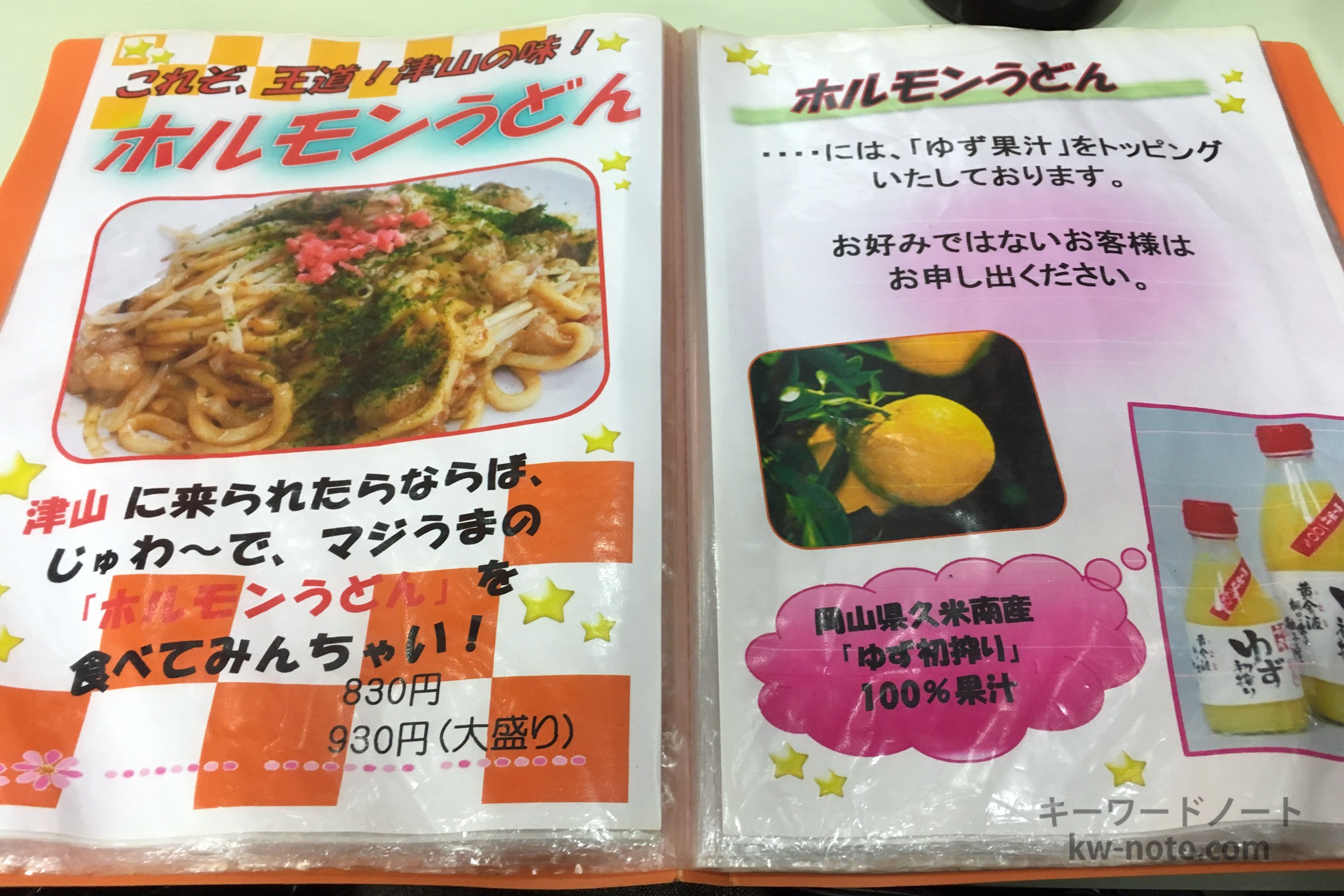 40年以上前から(2023年時点)営業している、津山ホルモンうどんを提供するお店としては老舗として挙げられます。