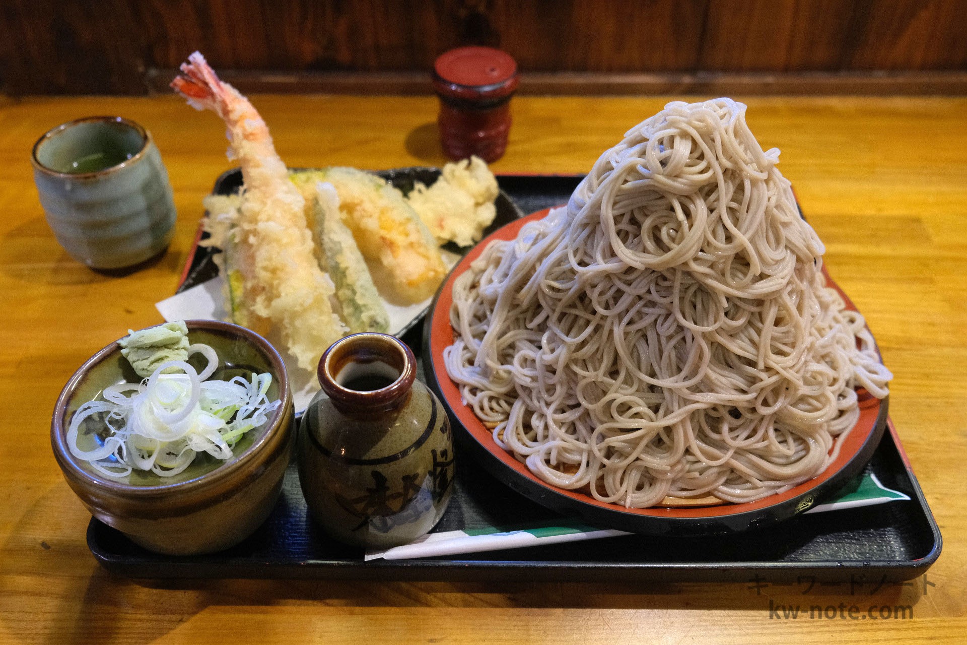 1kgという重さがあり山のように高く積まれた「富士山盛り」が有名で、サラリーマンをしていた創業者が近所の蕎麦屋で食べていた値段も高く量が少ない「つけ天」を、いつかお腹いっぱい飽きるほど食べたいという思いから、経営が安定しはじめた頃に考案したのが ”富士山盛り” とのこと。