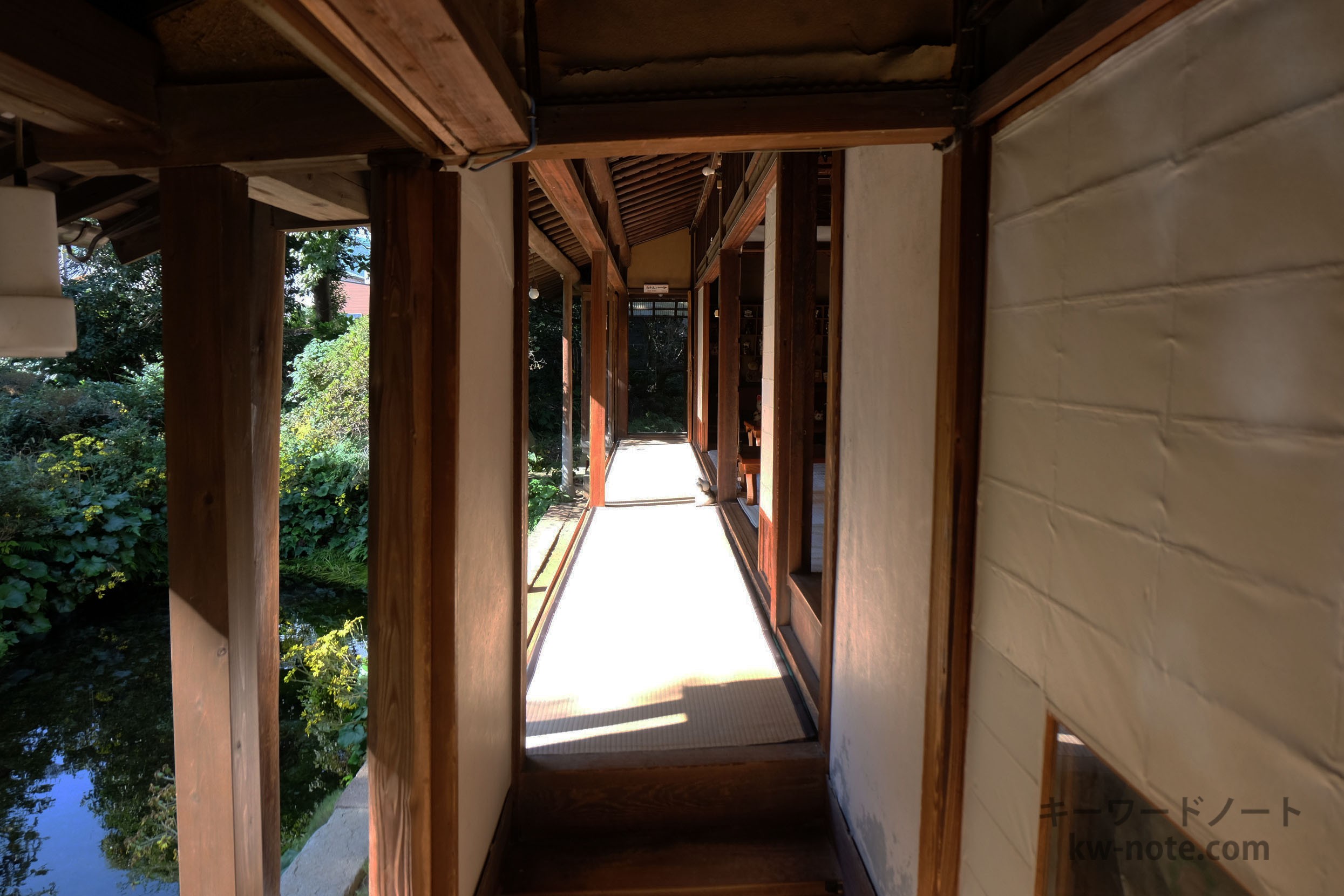 先程の雰囲気から一変、日の当たる屋外になっていて、透明度の高い湧水の池と庭園、古民家が目の前に現れます。