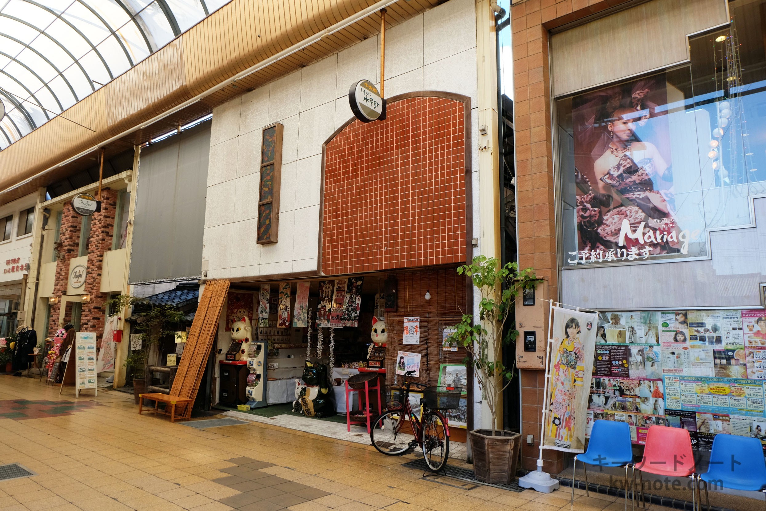 招き猫を販売するお店の横に、商店街とは明らかに違う雰囲気のエントランスが見えます。