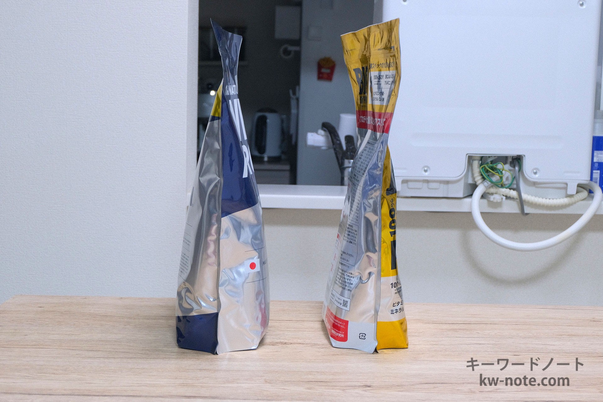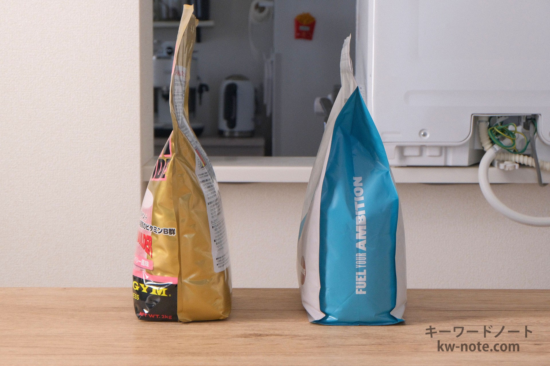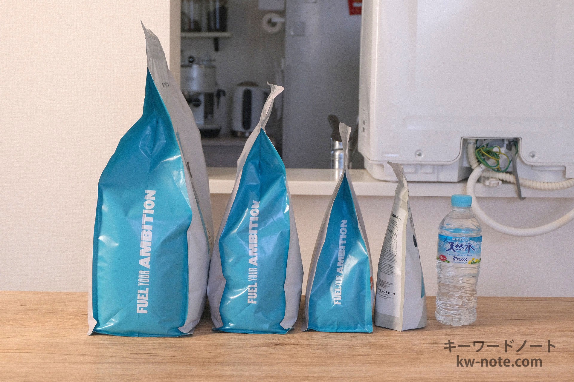 なおホエイとソイなどプロテインの種類によってやや比重が違いますが、大きくは変わらないため袋の大きさもそれほどの違いは無いものと考えて問題ないかと思います。