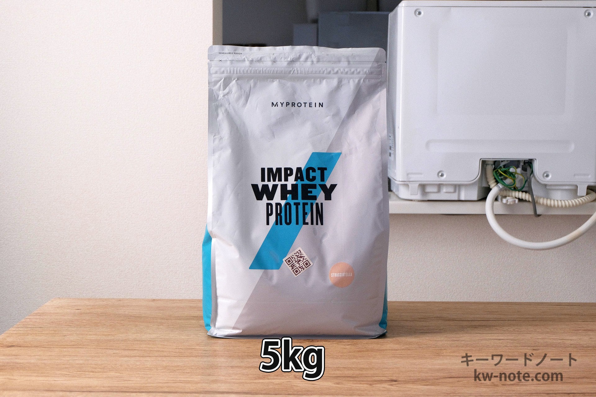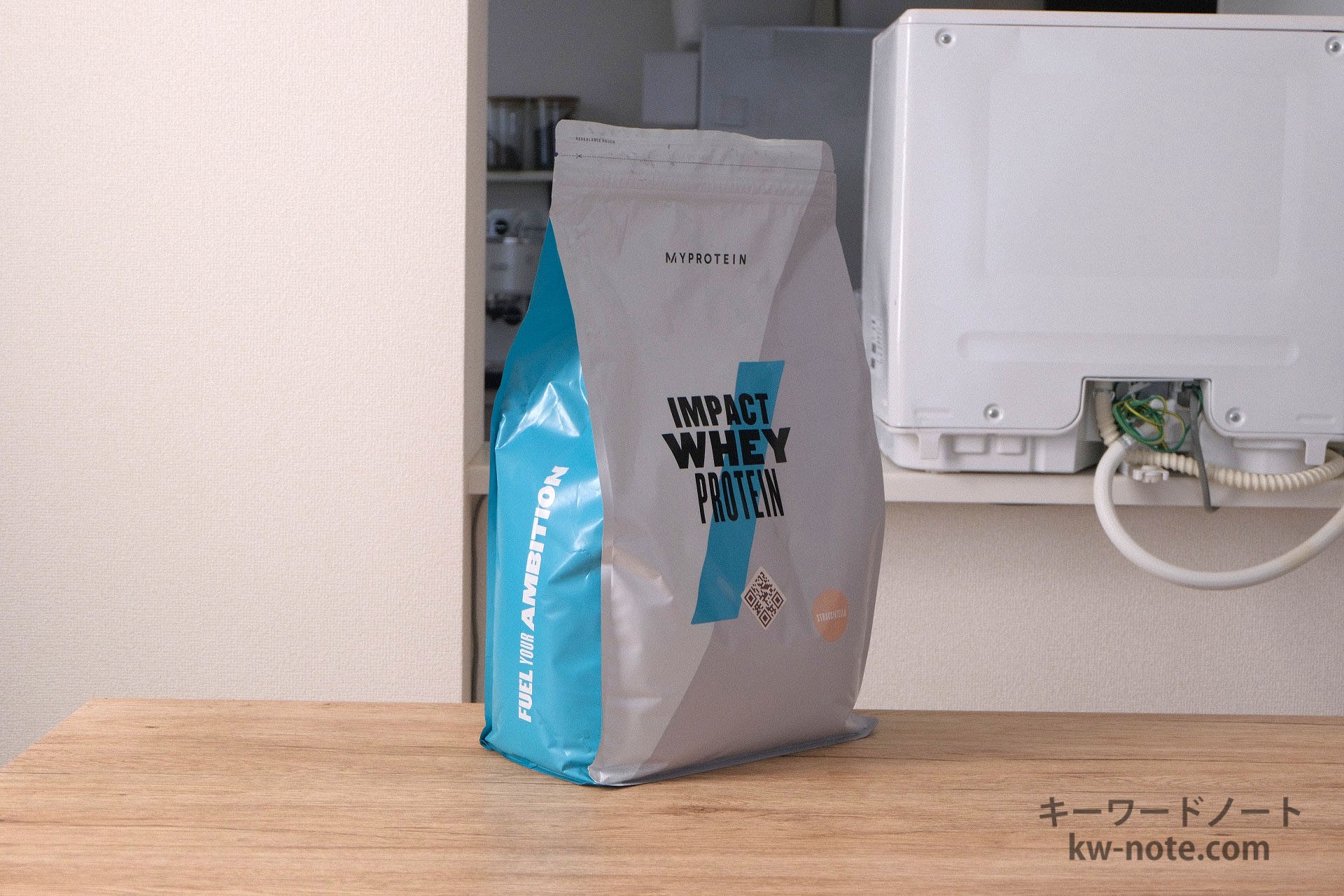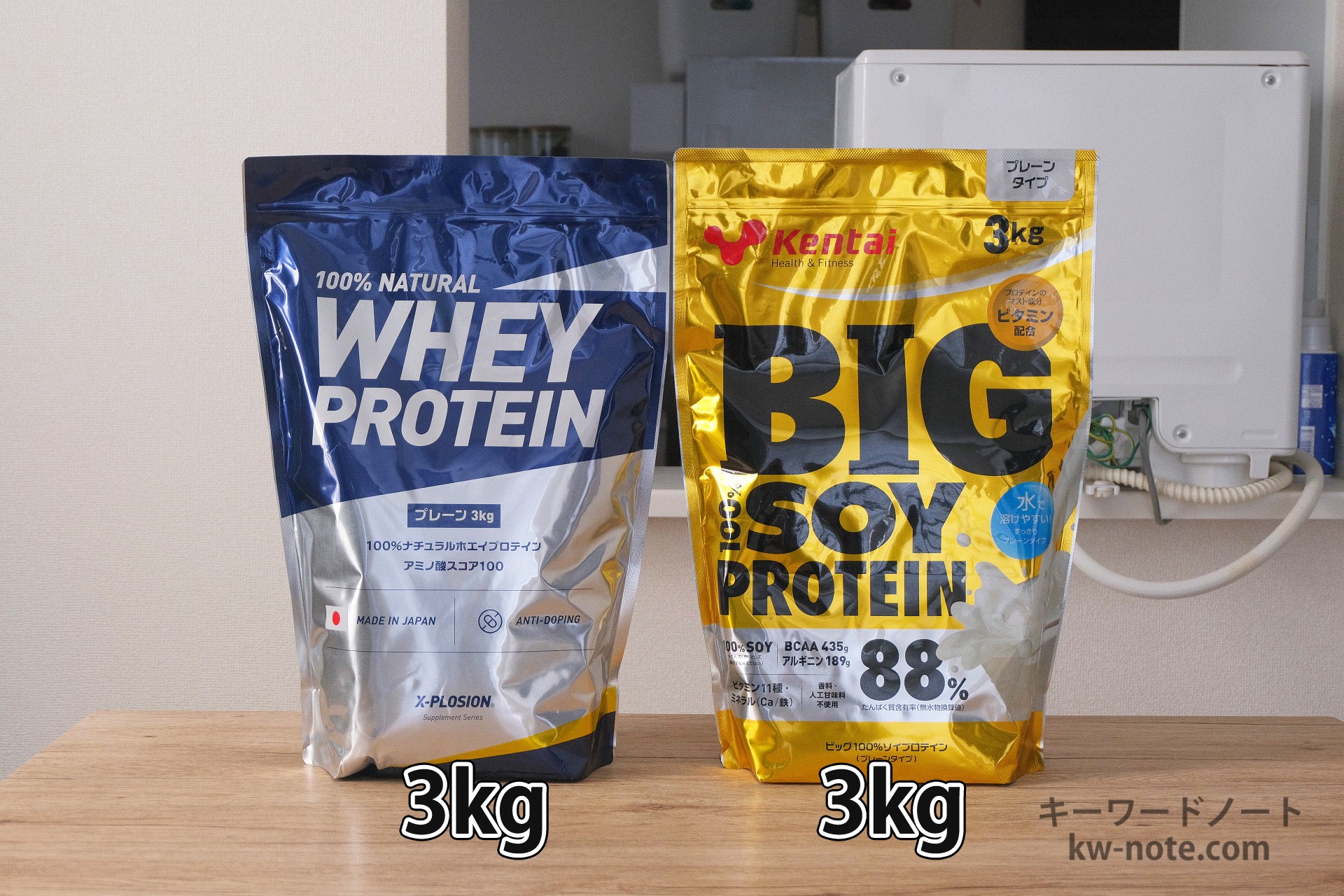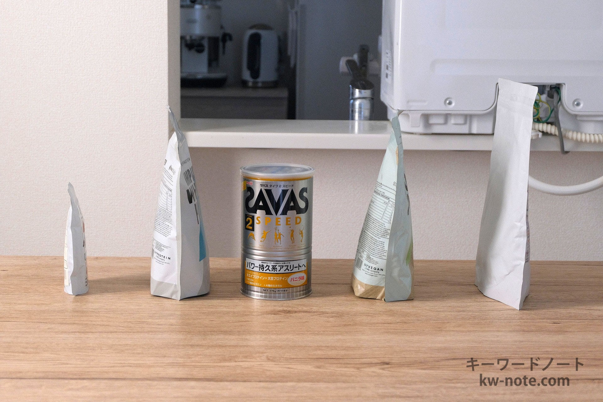 なおホエイとソイなどプロテインの種類によってやや比重が違いますが、大きくは変わらないため袋の大きさもそれほどの違いは無いものと考えて問題ないかと思います。
