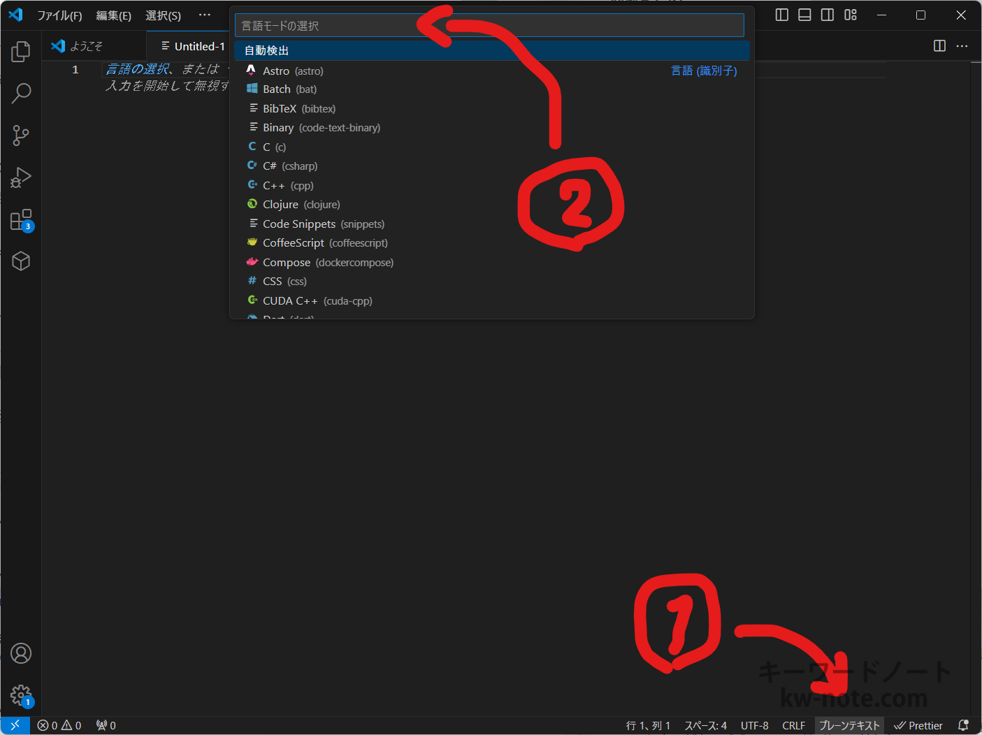 リポジトリやコードファイルなどで開かず、新しいタブ「Untitled」で開いた場合、コードとは認識されず普通のテキスト扱いになっています。